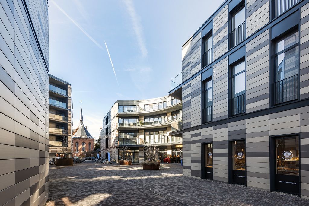 Een aantrekkelijke functiemix realiseren is één zaak, maar het kwam er uiteraard ook op aan om het project te verankeren in de binnenstedelijke omgeving. Dat was een complexe oefening, geeft Eyers aan: “Dynamiek was het codewoord. We zijn op zoek gegaan naar referentiepunten in de omgeving, en die vonden we in de eerste plaats in het aanpalende Groep T-gebouw. Door de yin-yangfilosofie toe te passen en te extrapoleren naar het nieuwe project, kwamen we tot het allesomvattende basisidee: waar de dynamiek in het Groep T-gebouw integraal voortvloeit uit het heldere, centrale atrium, fungeert een donkerkleurig buitenatrium als spil van het Vesalius-complex. We hebben het bovengrondse gedeelte met woningen en horecazaken gegroepeerd rond een aantrekkelijke binnenstraat – inclusief fraaie zichtlijnen – om de site een open, doorwaadbaar karakter te geven. Tot slot hebben we enkele zeventiende- en achttiende-eeuwse gevels langs de Tiensestraat in ere hersteld en naadloos geïntegreerd in de ontwikkeling.”