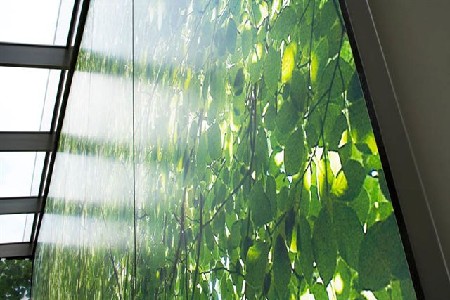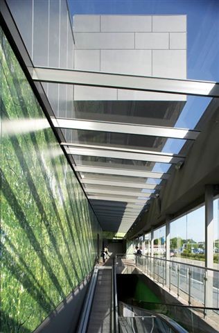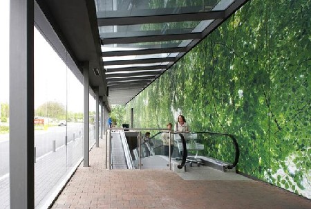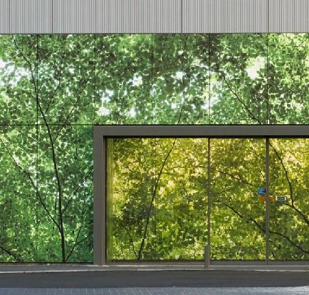 Het oorspronkelijke idee van een natuurlijk begroeide gevel voor het nieuwe complex aan de Parklaan in Turnhout kon niet gerealiseerd worden wegens de noordelijke oriëntatie, die de overlevingskansen voor de beplanting nadelig zou beïnvloeden. Vervolgens werd overwogen om gebruik te maken van geëtst glas, maar ook dat bleek niet het gewenste resultaat op te leveren. Door toepassing van de ‘MEG Digital Print’ kon het basisidee overeind blijven.