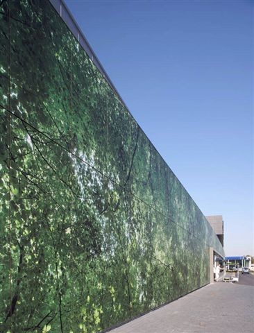 MEG is een zelfdragend systeem uit hoge druk laminaat (HPL) met een decoratief oppervlak dat aangewend kan worden in een buitenomgeving. Op de MEG HPL gevelplaten was het mogelijk een foto van een natuurlijk bladerdek uit te zetten. Deze foto-opname, die als basis diende voor het uitprinten van de MEG Digital Print gevelplaten ,was liefst 90 x 5 m groot! Dit basisbeeld werd vervolgens grafisch bewerkt om de uiteindelijke beelden voor het personaliseren van de MEG gevelplaten te bekomen. Elke gevelplaat toont een uniek beeldfragment. Een bijzondere finesse schuilt in de geveluitsnede voor de inkompartij. Het beeld op de gevel is naadloos doorgezet op de dieper liggende scheidingswand die de circulatiegang met toegang tot de ondergrondse parking afschermt van de winkelruimte. Dat vereiste een bijzonder minutieuze voorbewerking van de digitale beeldbestanden alvorens tot de druk ervan te kunnen over gaan en vervolgens een uiterst precieze verzaging en montage van de aangeleverde gecodeerde MEG Digital Print platen. Alle MEG gevelplaten zijn onzichtbaar bevestigd door middel van speciale schroeven op een aluminium Justimax draagstructuur. De volledige montage van de gecodeerde panelen vergde slechts anderhalve dag.