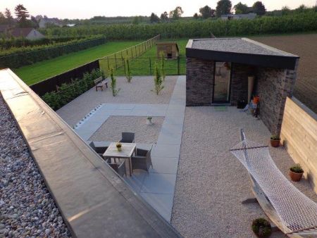 Het vrijstaande tuinhuis is eveneens afgewerkt met de Zero-steen. Tussen de twee donkere volumes in bevindt zich een mooie, grotendeels verharde tuin. Deze is bekleed met grijze betonsteenklinkers van Ebema, grote tegels met minimale tussenvoegen die bijzonder weinig onderhoud vereisen. “Ik wilde absoluut een tuin, maar zag het niet zitten om er veel in te werken omdat het voor mij fysiek niet meer haalbaar is,” vertelt Janine. “In mijn vorig huis zat ik met kleine klinkers waartussen het onkruid welig tierde. Nu hoef ik mijn tuin gelukkig amper te onderhouden. De klinkers van Ebema spelen hier een belangrijke rol in. Ze laten weinig tot geen onkruidvorming toe en passen qua design bovendien perfect in het geheel. Door hun ruwe oppervlak kan je er – zelfs bij ijzelvorming – steeds stabiel over verplaatsen. Zoals ik al eerder zei: het lijken misschien details, maar voor mij zijn het zaken die je toelaten om comfortabel door het leven te gaan. Ik hecht er enorm veel belang aan, en hoop velen bij het zien van deze woning van dat belang te kunnen overtuigen.”