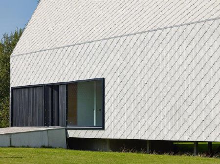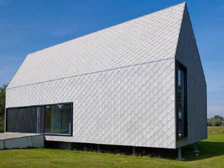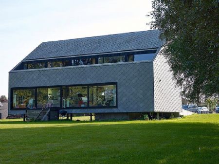 Vlamingen worden geboren met een baksteen in de maag. Uitzondering op deze regel is Sven Moreels met zijn woonst House M. Voor deze paalwoning aan de Schelde in het Oost-Vlaamse Oudenaarde-Eine koos hij, samen met CAAN architecten (Gent), voor een bedekking met leien van de nok tot de fundering. Geen baksteen dus, wel de Ardonit natuurgrijze lei van SVK.