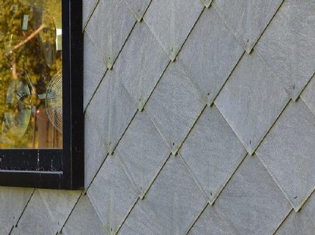 Naast de uniformiteit gaven ook de vorm en de kleur van de natuurgrijze lei de doorslag volgens Cocquyt. “Het gebruik van ruitleien zorgt voor een leuke textuur die doet denken aan een schubbenhuid. Daarbij beschikken de natuurleien over een kleurnuance die de schubbenwerking extra in de verf zet, en die onze voorkeur wegdraagt ten opzichte van de meer egaal gekleurde leien. Na verloop van tijd worden de natuurleien grauwer, maar dat verouderingseffect geeft net extra cachet aan de woning. De bouwheer was mits enkele bezoeken aan gelijkaardige projecten zeer vlug gewonnen voor een woning die uit de band springt.”