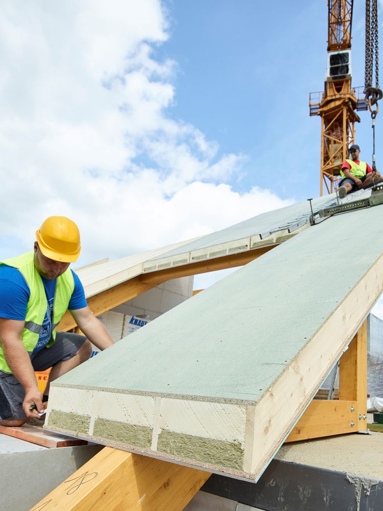 Verder scoren de nieuwe dakelementen ook uitstekend op vlak van geluidsisolatie. De standaardpanelen voldoen aan de basiseisen uit de akoestische norm (NBN S 01-400-1). Zelf wanneer de opdrachtgever nog strengere eisen oplegt, omwille van omgevingsgeluid – zoals een drukke weg -, bieden de nieuwe Ecoon dakelementen een antwoord. Sterker nog, de ‘Comfort’-lijn uit het gamma presteert voor eenzelfde binnenafwerking tot 46 (-2, -8) dB. Om die goede akoestische prestaties te halen, heeft UNILIN een systeem ontwikkeld met een samengestelde isolatiekern en geïntegreerd onderdak, dat de eigenschappen van beide isolatiematerialen optimaal benut. In combinatie met de dakbedekking, wordt zo een massa-veer-massa systeem gecreëerd.