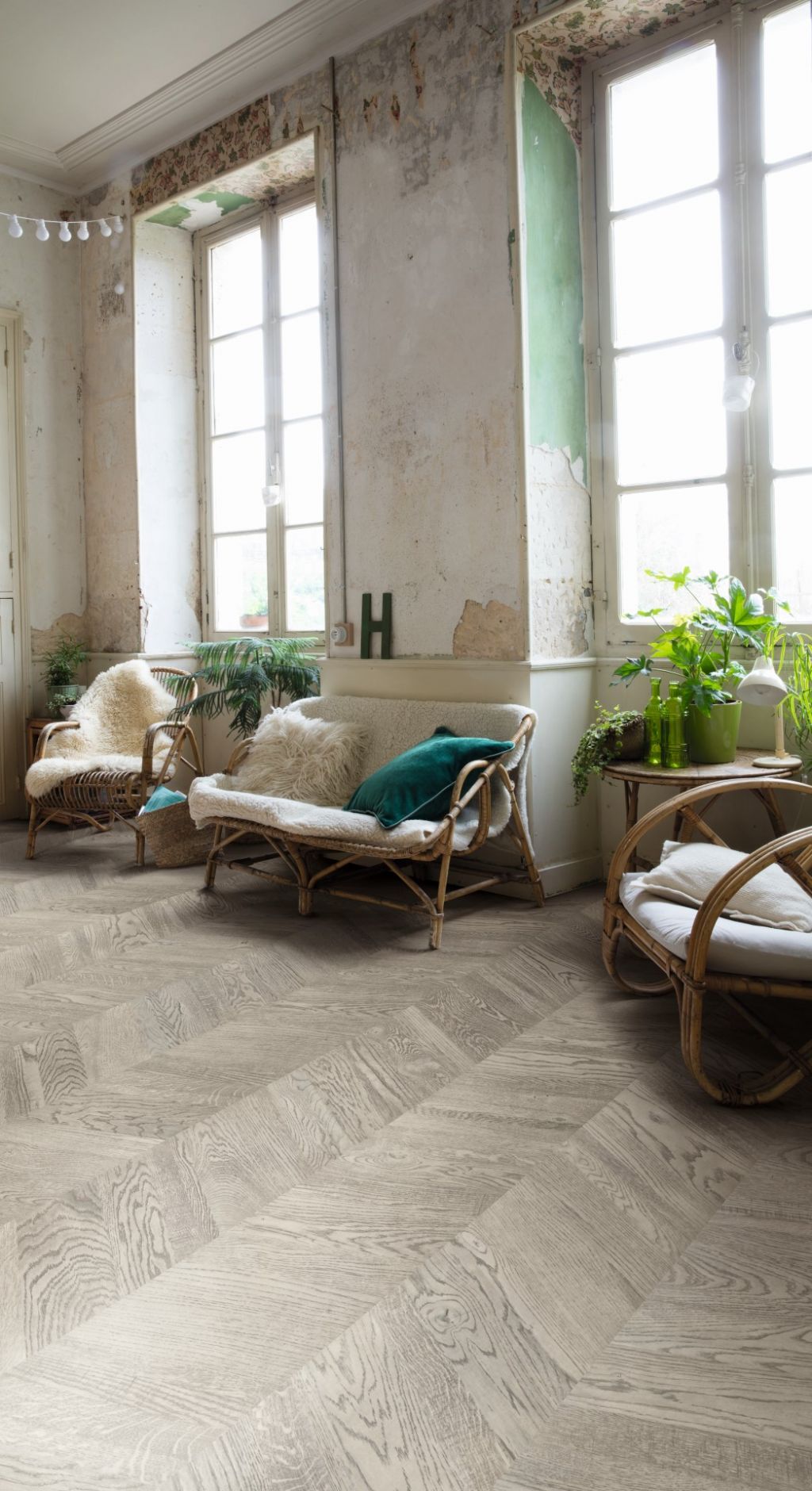 De Eligna-collectie kreeg een upgrade waardoor deze vloeren nu waterbestendig zijn. Met de Eligna Metallic Cérusé Oak Gold toont Quick-Step dat goud ook in huis past. Het is een laminaatvloer met houtkleur en subtiele gouden accenten in de nerven.