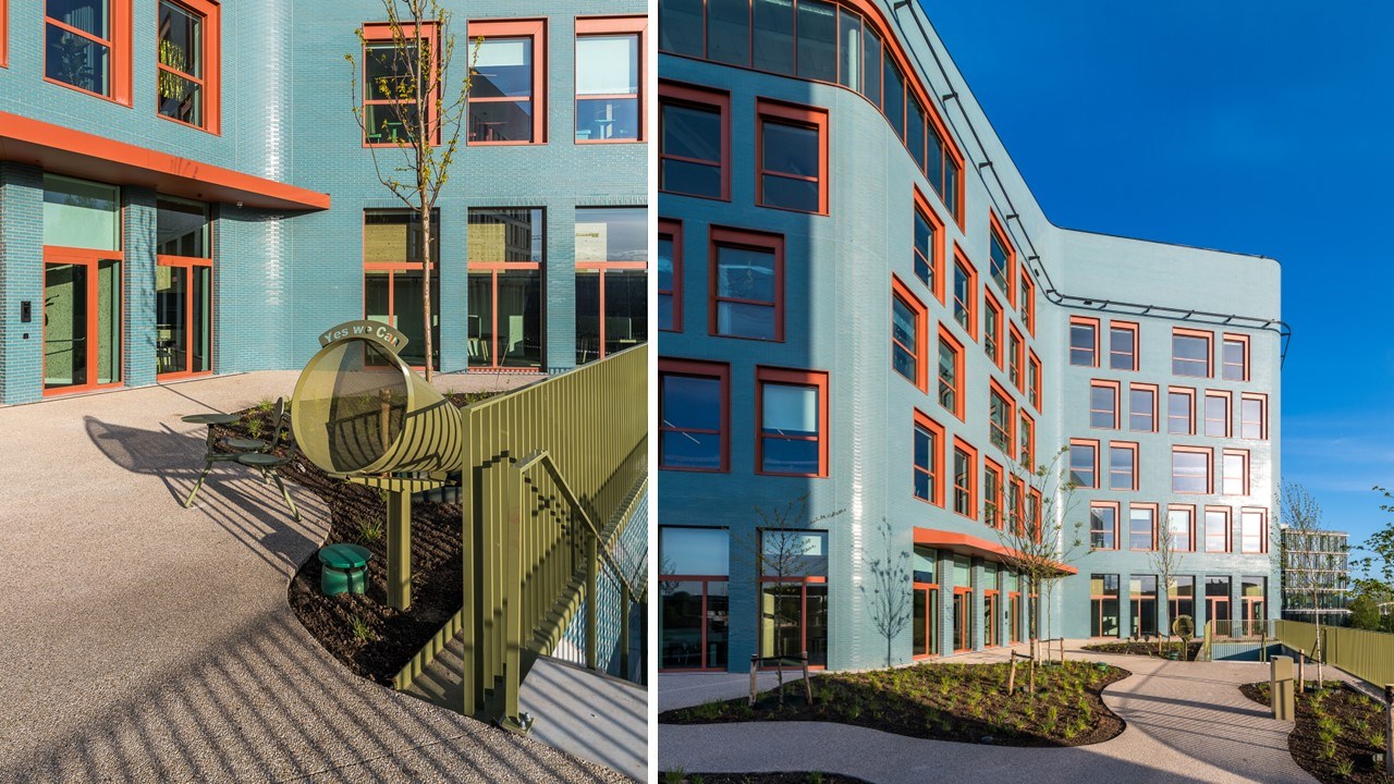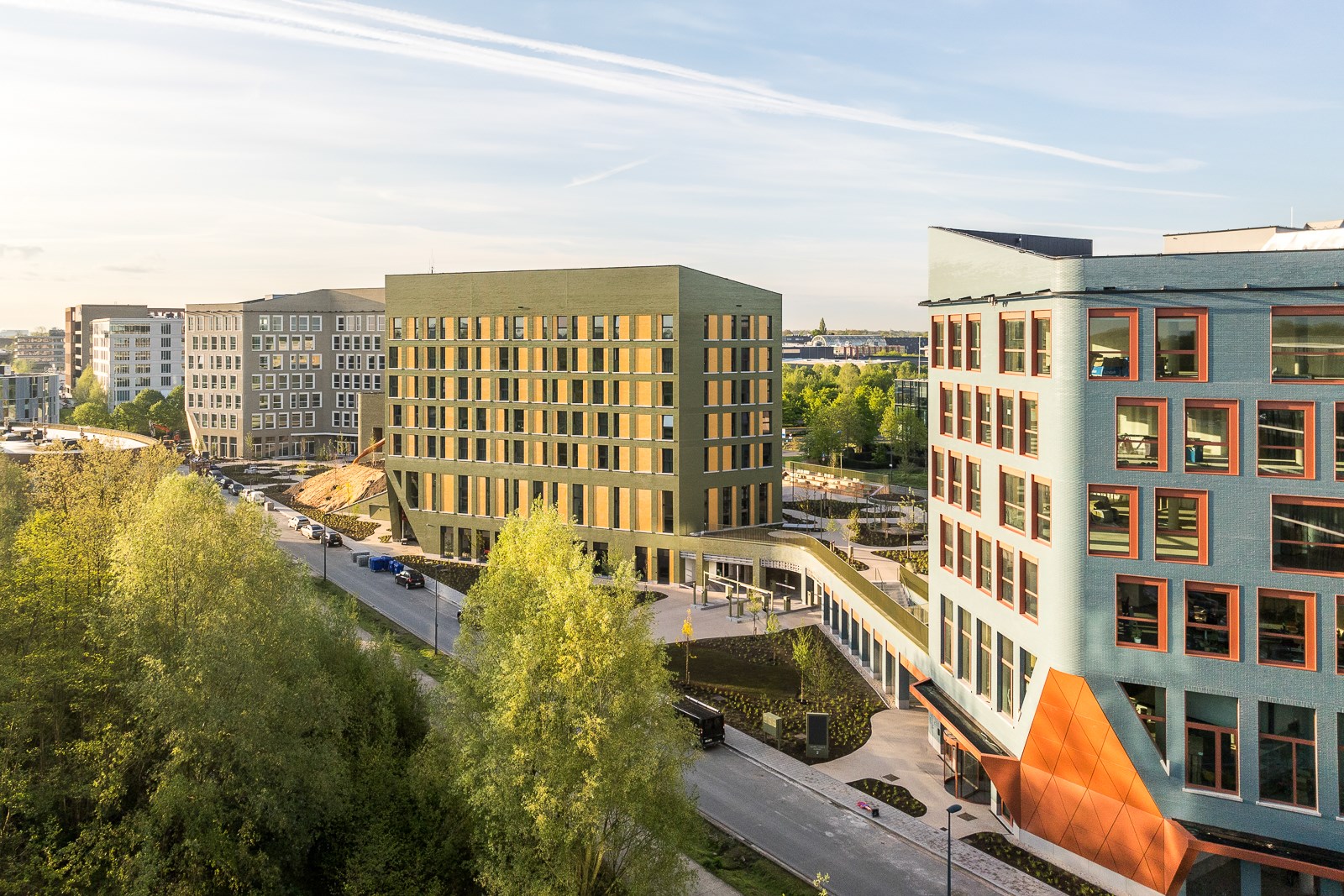 Het architectonische ontwerp van de campus (Bontinck Architecture), gekenmerkt door een honingraatstructuur, zorgt voor optimaal daglicht en een directe verbinding met de groene buitenruimte (Studio Basta). Dit ontwerp verhoogt niet alleen het welzijn van de gebruikers, maar stimuleert ook creativiteit en flexibiliteit.