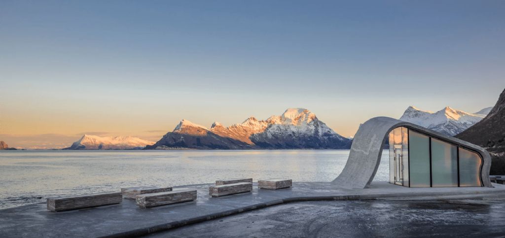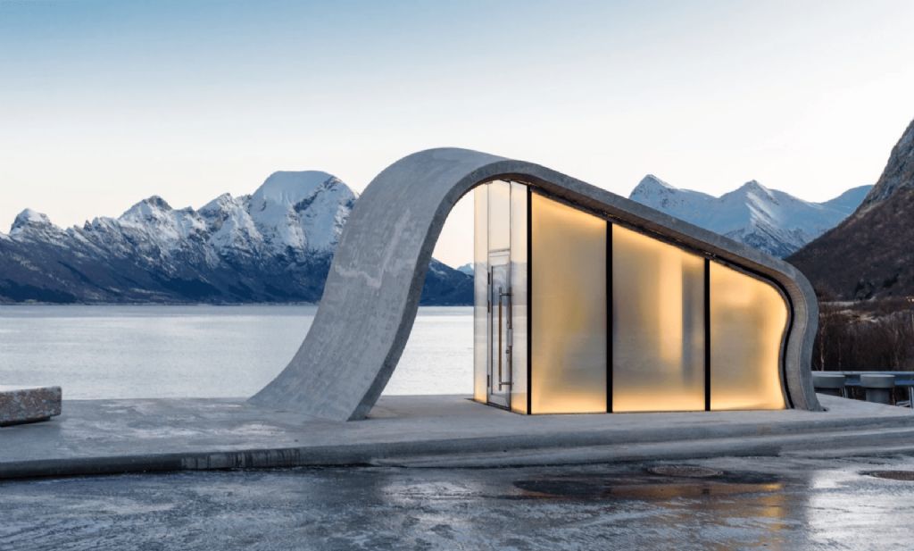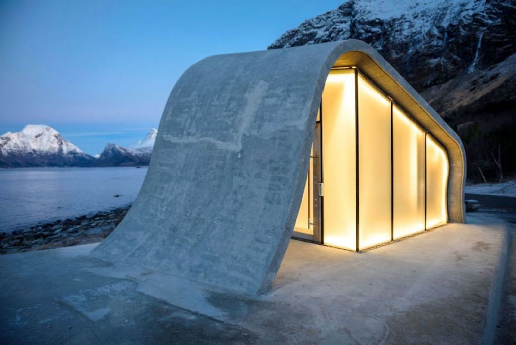 In Gildeskål, Noorwegen, kan je het noorderlicht bewonderen vanop het toilet. Maar naast de bijzonder vormgegeven publieke toiletten aan de oever van de zee, omvat Ureddplassen (wat ‘plek zonder vrees’ betekent in het Noors) ook een terras, amfitheater en een herdenkingsmonument.