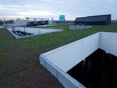 Het aflopend dak van het gebouw is door de firma De Boer uitgewerkt als een groendak en trekt daardoor als het ware een groen landschap over het gebouw heen. Ook de verschillende insprongen in de gevel (als patio of als inkomhal) brengen de omgeving tot in het gebouw.