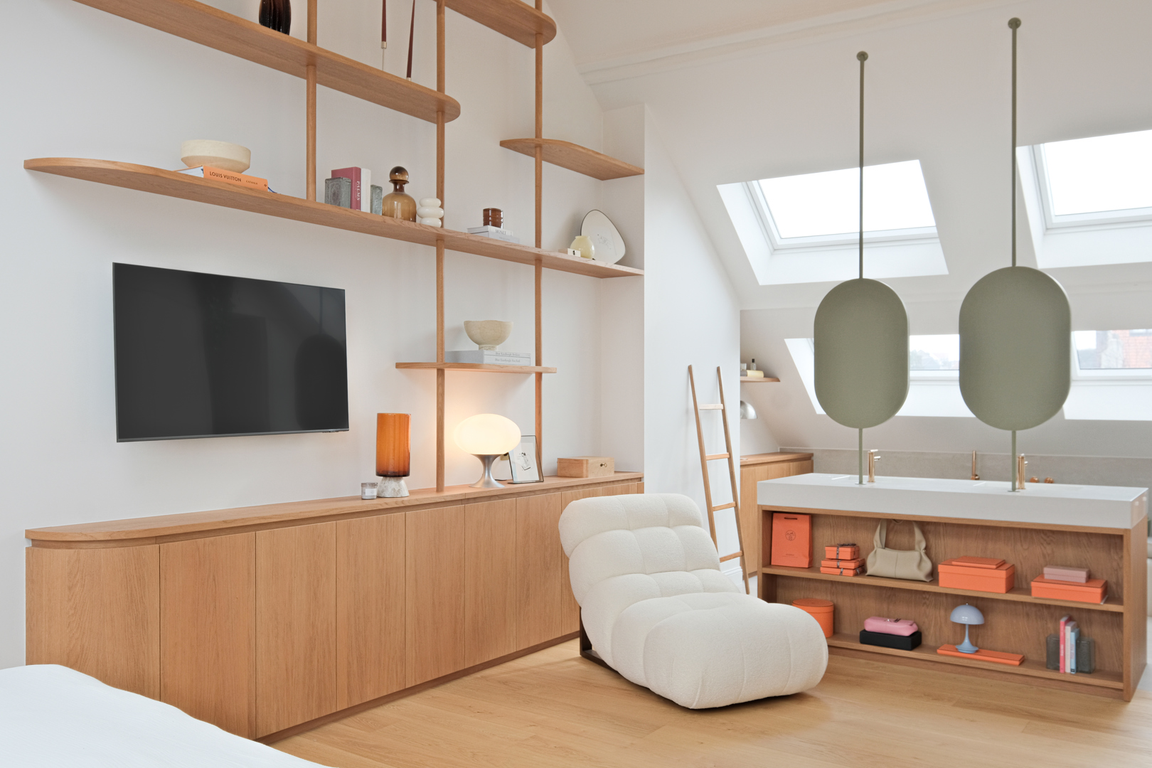 De oorspronkelijke zolder was donker, slecht geïsoleerd en energie-intensief (label F). De renovatie transformeerde deze ruimte tot een volwaardige woonlaag met slaapkamer, badkamer (bad en douche) en dressing.