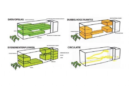 De maximale toelaatbare belasting van de oude vloeren en funderingen van het voormalige kantoorgebouw was onvoldoende om er een hedendaagse belevingsbibliotheek in onder te brengen. Bovendien was de bestaande vrije hoogte van de verdiepingen slechts 2,6 meter, eigenlijk te laag voor een publiek gebouw. Daarom werden op strategische plaatsen betonnen vloeren weggehaald. Zo ontstaan dubbelhoge ruimtes en wordt het gebouw lichter. Door die ingreep kan het gebouw extra belast worden met boeken.