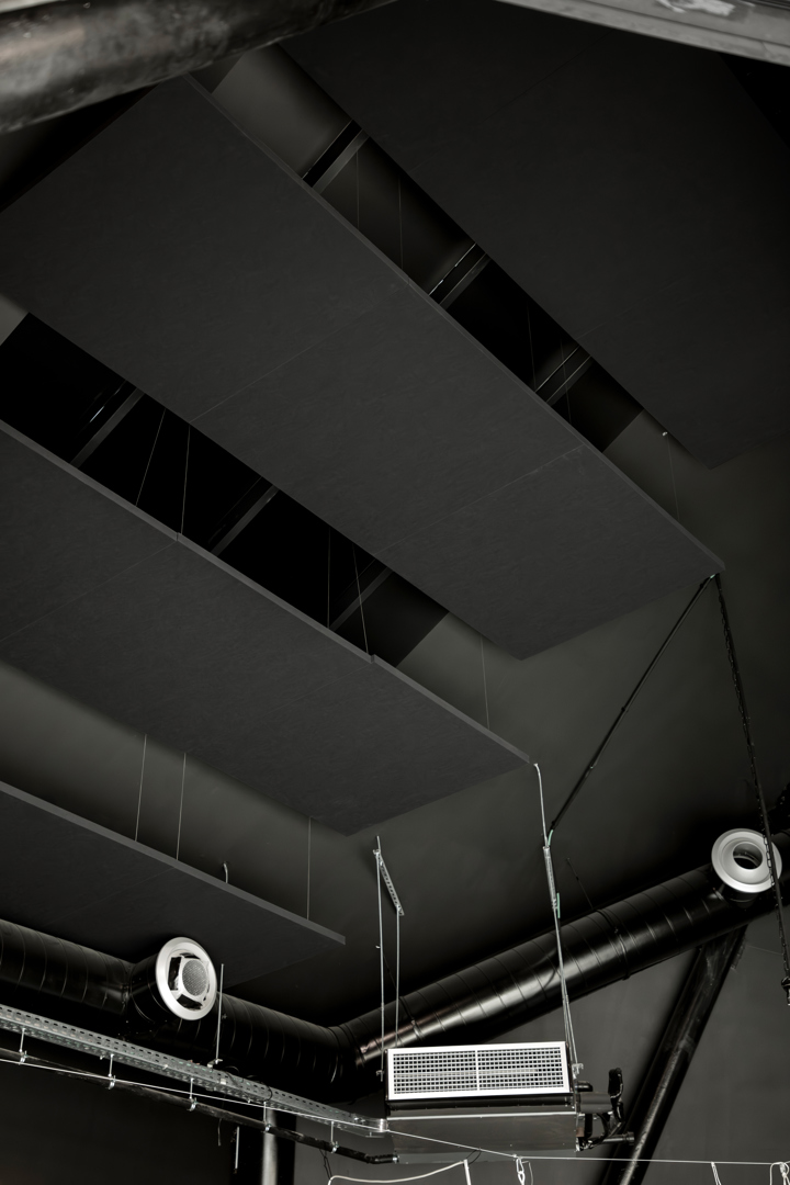 De verschillende expositieruimtes binnen Le Pavillon hebben elk een eigen scenografie. De akoestische aanpak volgt deze diversiteit. In donkere, meer industriële omgevingen werden zwarte Rockfon Color-all panelen toegepast die naadloos aansluiten bij de architectuur. In lichtere ruimtes zorgen witte panelen voor een heldere en rustige uitstraling. Daarnaast werden Rockfon Eclipse kaderloze plafondeilanden ingezet om specifieke zones gericht te behandelen zonder ingrijpende structurele aanpassingen.