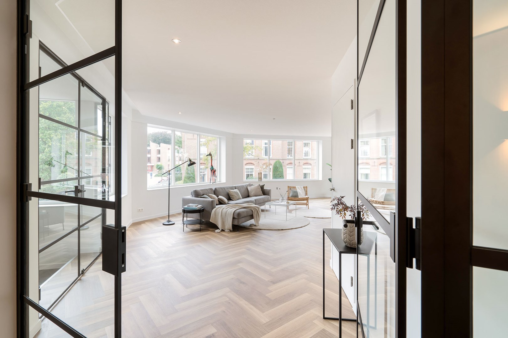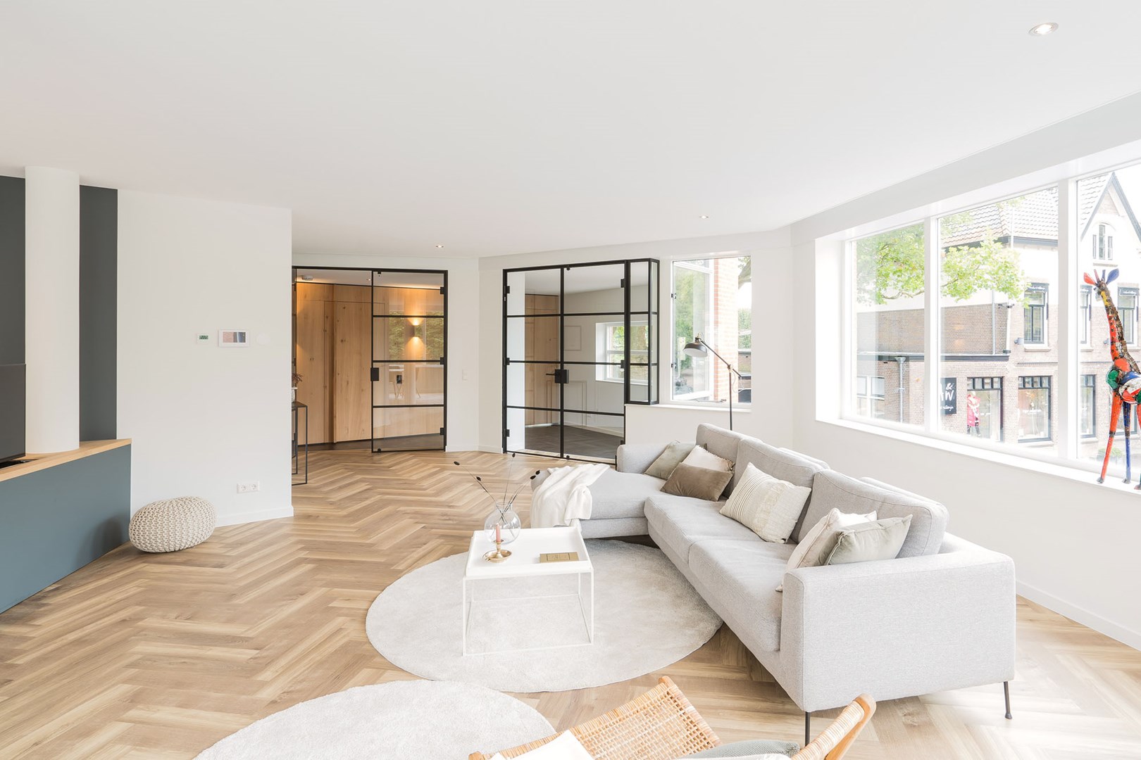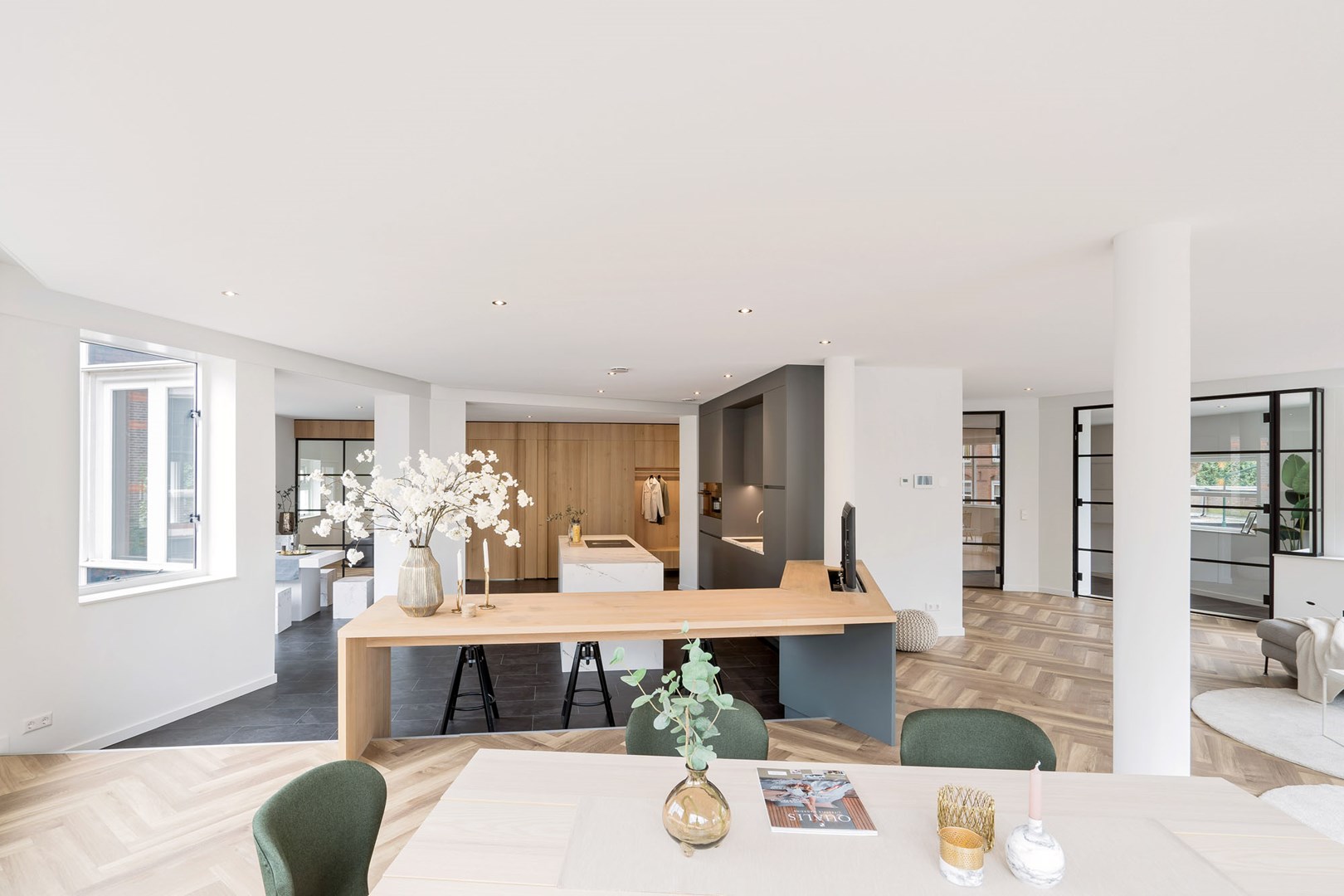 De woonkamer, keuken en gang van het penthouse lopen naadloos in elkaar over. Dit zorgt voor de ruimtelijke uitstraling van de woning, maar vraagt tegelijkertijd om een doordachte, akoestische oplossing. Geluid krijgt namelijk vrij spel in de open ruimten en wordt daarbij extra weerkaatst door de aanwezige glazen wanden en deuren.