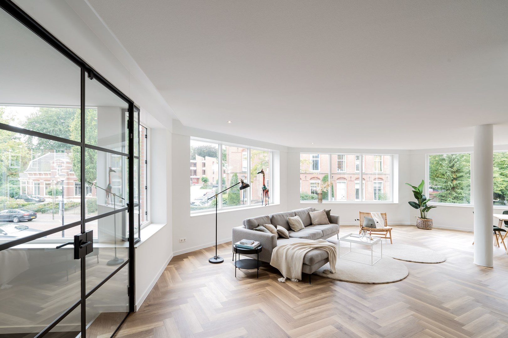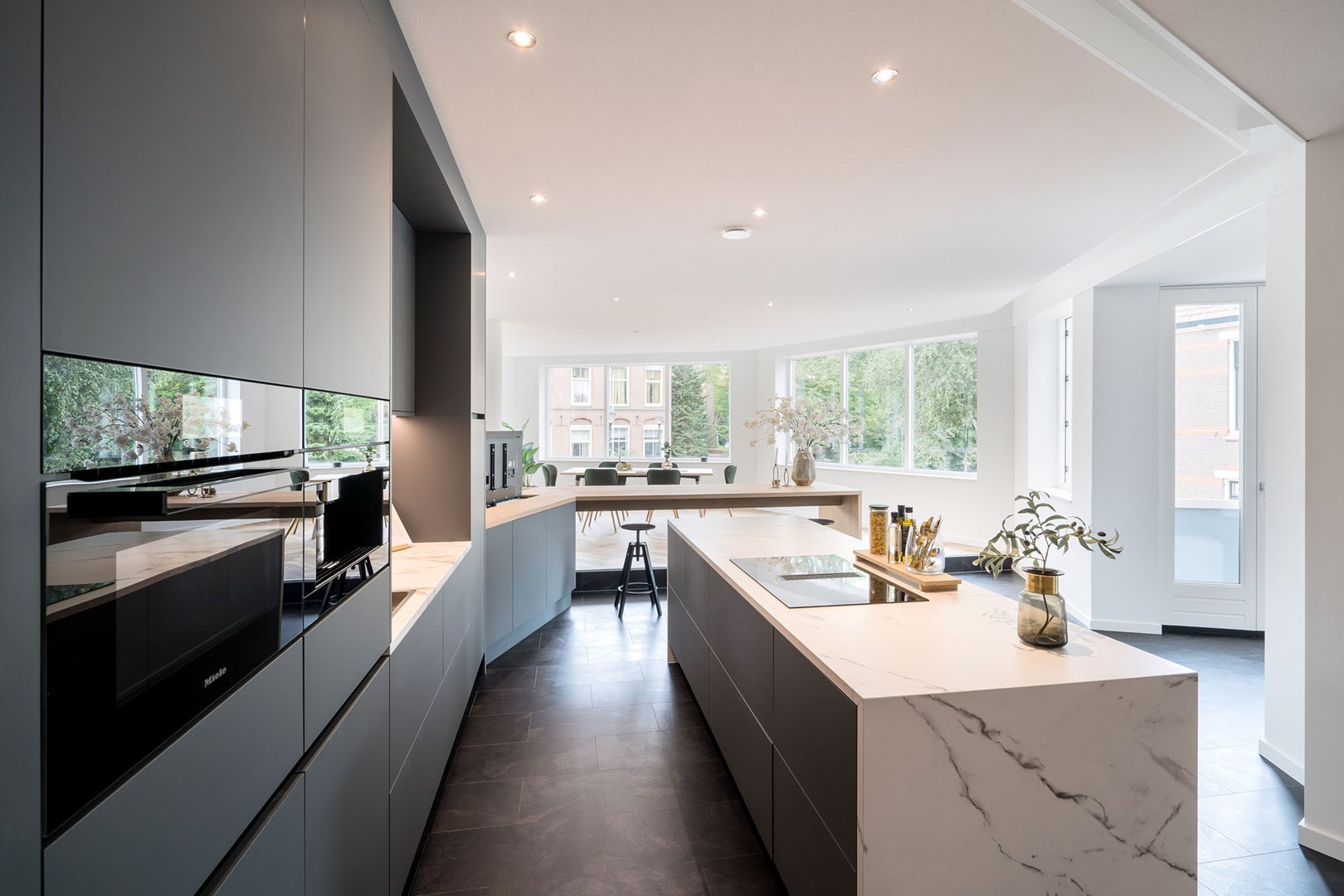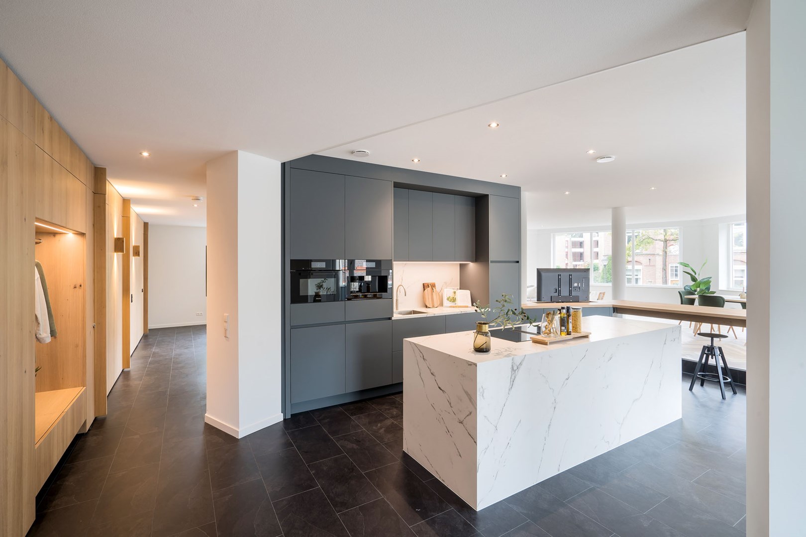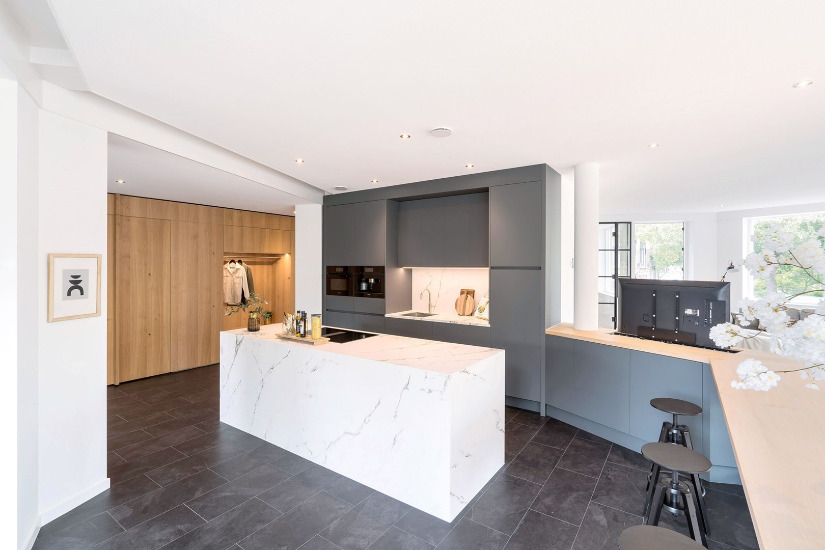 De woonkamer, keuken en gang van het penthouse lopen naadloos in elkaar over. Dit zorgt voor de ruimtelijke uitstraling van de woning, maar vraagt tegelijkertijd om een doordachte, akoestische oplossing. Geluid krijgt namelijk vrij spel in de open ruimten en wordt daarbij extra weerkaatst door de aanwezige glazen wanden en deuren.