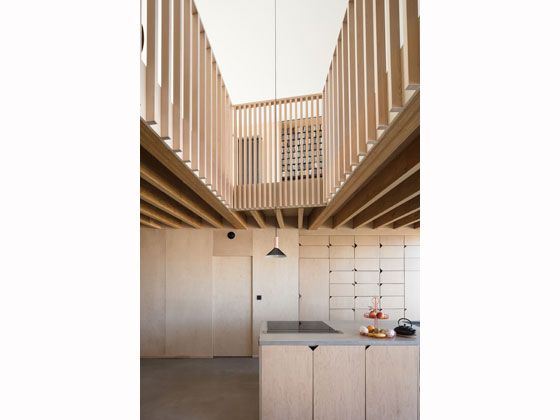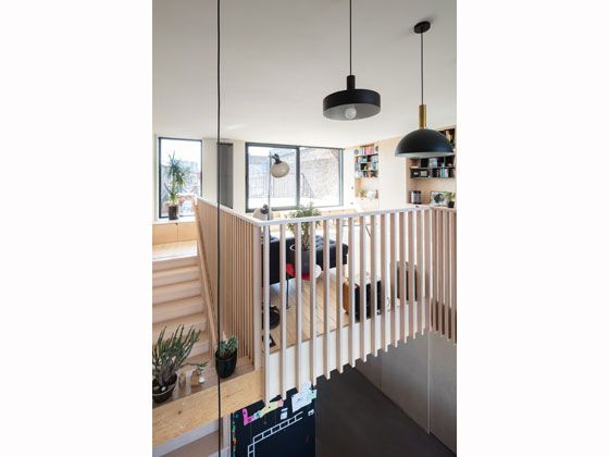 “De open inkomhal in het midden van de woning, vormt de schakel tussen het slaapgedeelte aan de achterzijde, de badkamer en het kook- en eetgedeelte aan de voorzijde. Alle gesloten functies – technische ruimte, kasten, toilet … – werden weggewerkt achter een lichte wand. Vanuit de inkomhal vertrekt ook de nieuwe trap die zich boven de bestaande trappenhal wentelt. Op de bovenste verdieping bevinden zich aan de voorzijde een zitruimte en werk- of speelruimte en aan de achterzijde een meer afgeschermd terras dat – zodra ze zich laat zien – in de zon baadt. De opstap naar het terras is tegelijk zit- en bergruimte. Dankzij een vide aan de trap valt het licht binnen tot in het hart van de woning.”