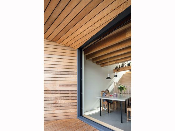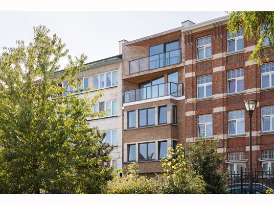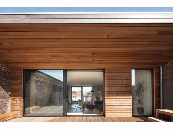 De rooilijnen en de schuine perceelgrenzen vormen de basis voor de inrichting van de gevels en de woning. “De voorgevel is lichtjes teruggetrokken om bovenop de erker van het bestaande volume op beide verdiepingen van de duplexdakwoning een beschermd terras met zicht op het park mogelijk te maken. In de leuningen en borstweringen komen opnieuw houten latjes terug. Dat is ook aan de achtergevel het geval. Beide gevels kenmerken zich voorts door grote raampartijen.”