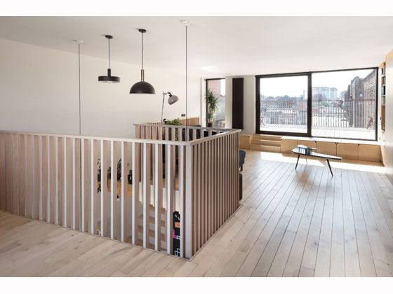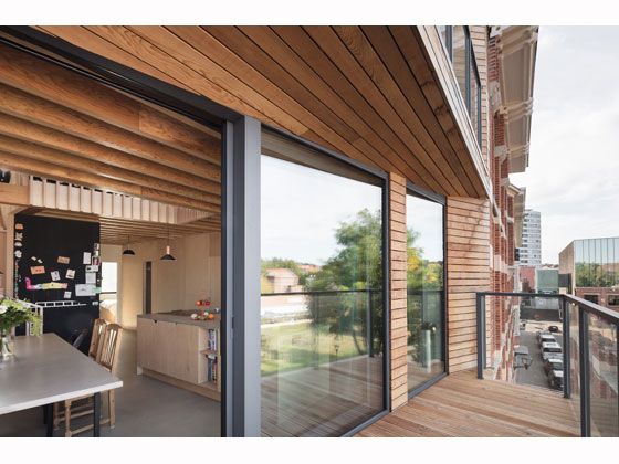De duplexdakwoning, te bereiken via de bestaande trappenhal van het gebouw, valt op door haar houten gevelbekleding. Tegelijkertijd doet ze dat ook weer niet, aangezien de belijning van de bekleding past bij de horizontaal belijnde geeloranje bakstenen gevels in de straat. Zo vormt ze een architecturaal accent voor haar omgeving dat zich toch mooi integreert in de stedenbouwkundige context.