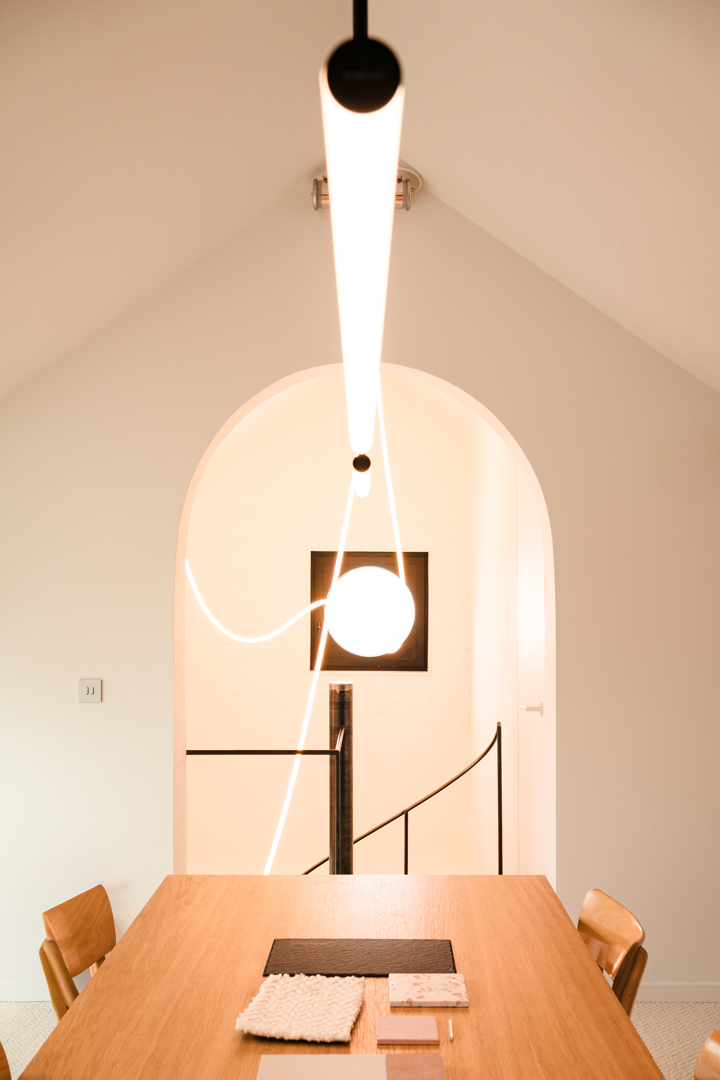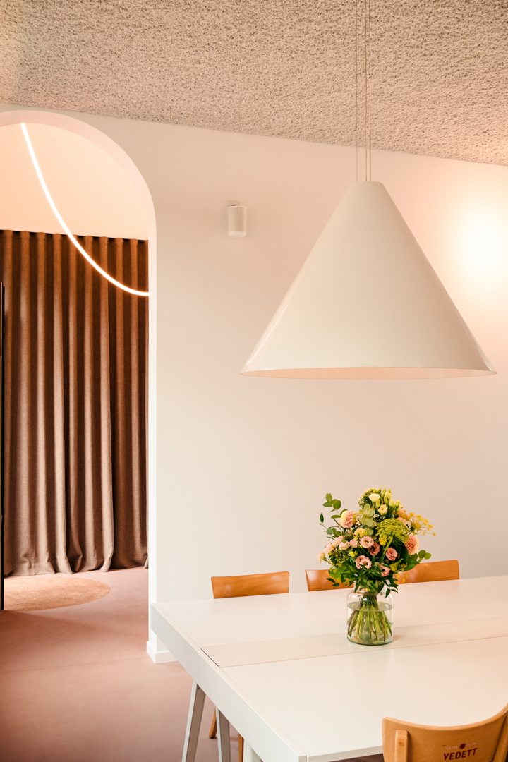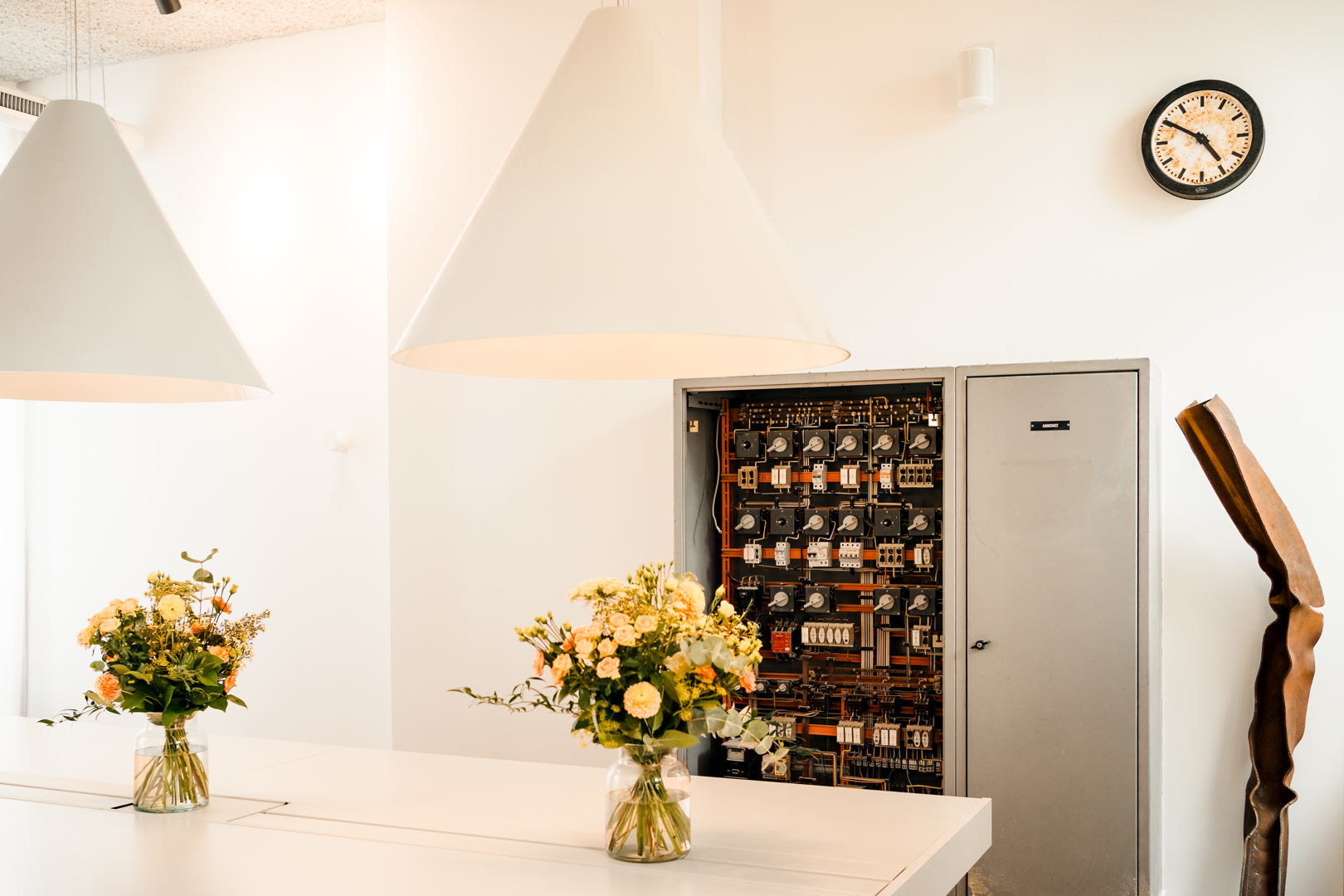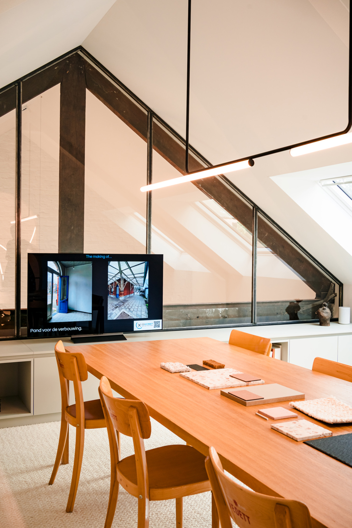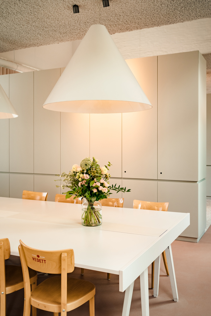 Ook enkele interieurelementen uit hun vorige kantoor kregen een nieuwe plek. Zo verhuisden de bureaus en de conische lampen mee, waardoor vertrouwde accenten de nieuwe ruimte verankeren. De hoogte van de lokalen werd bewust benut om licht en lucht centraal te stellen — essentieel in een pand dat ooit functioneerde als schakel in het openbaar vervoer en nu als ontmoetingsplek voor creativiteit. Het resultaat is een werkomgeving die even huiselijk als inspirerend aanvoelt, en waarin de identiteit van Concreet Architecten tastbaar aanwezig is.