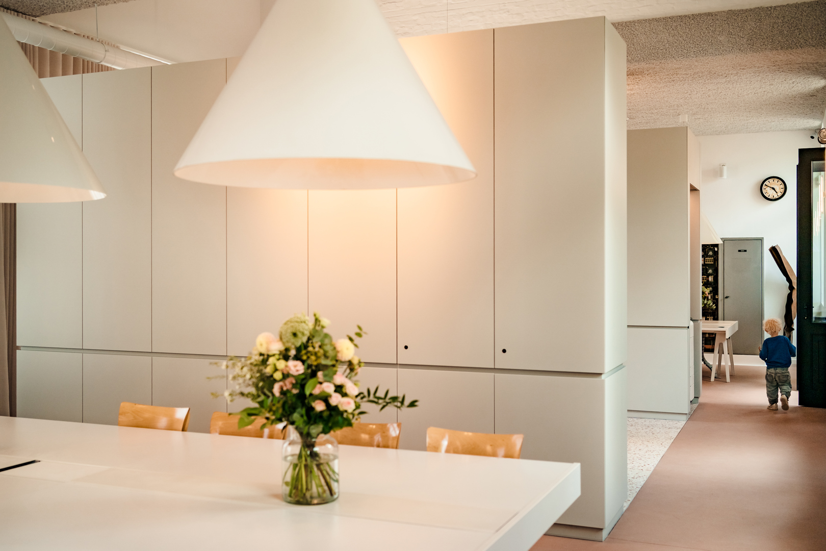 “We hebben het gebouw eerst integraal gestript, geïsoleerd langs de binnenzijde en uitgerust met nieuwe technieken, zoals vloerverwarming en een warmtepomp die instaat voor zowel verwarming als koeling,” vertelt Lien Gesquiere. “Nadien hebben we de inrichting volledig naar onze hand gezet, waarbij de woning een andere soort afwerking kreeg dan het kantoorgedeelte.”