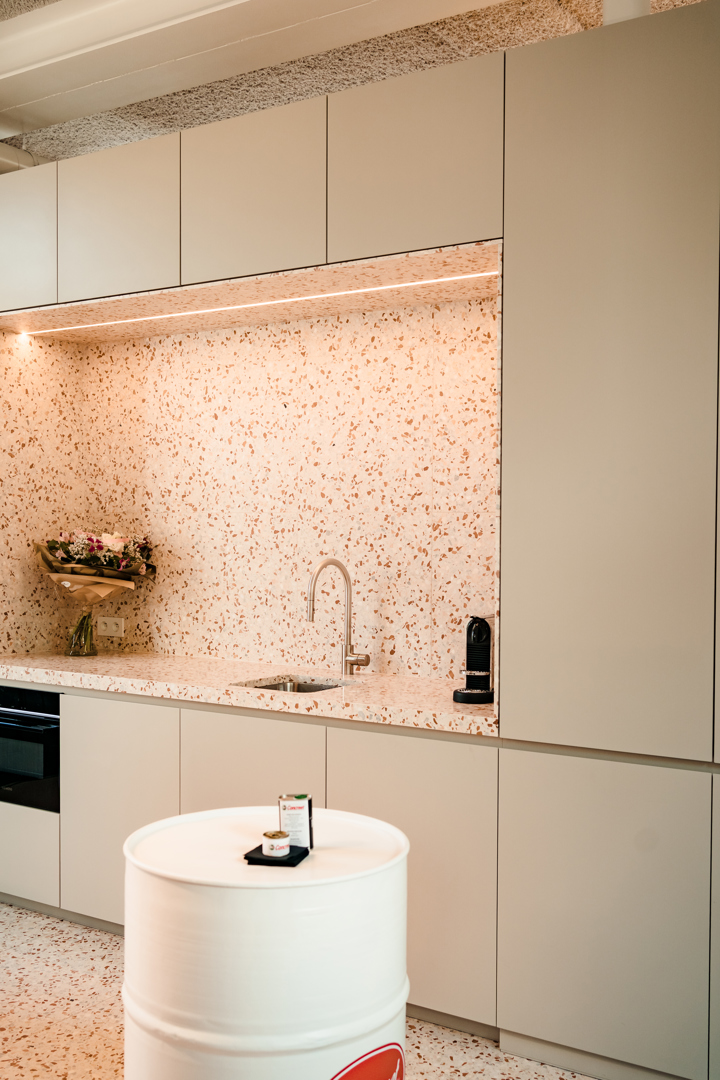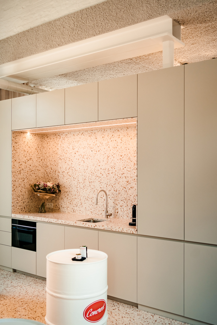 Het kantoorgedeelte kreeg dan weer een uitgesproken eigen identiteit. “Het mocht vooral niet te clean en afgelikt ogen,” zegt Gesquiere. “Daarom combineerden we witgeschilderd pleisterwerk met naadloze gietvloeren die een organische look hebben, terrazzovloeren in de keuken annex vergaderruimte, akoestische spuitplafonds en een spiltrap in ruw staal in het inkomgedeelte.” Die materialen zorgen samen voor een sobere, maar tactiele atmosfeer waarin werken aanvoelt als wonen.