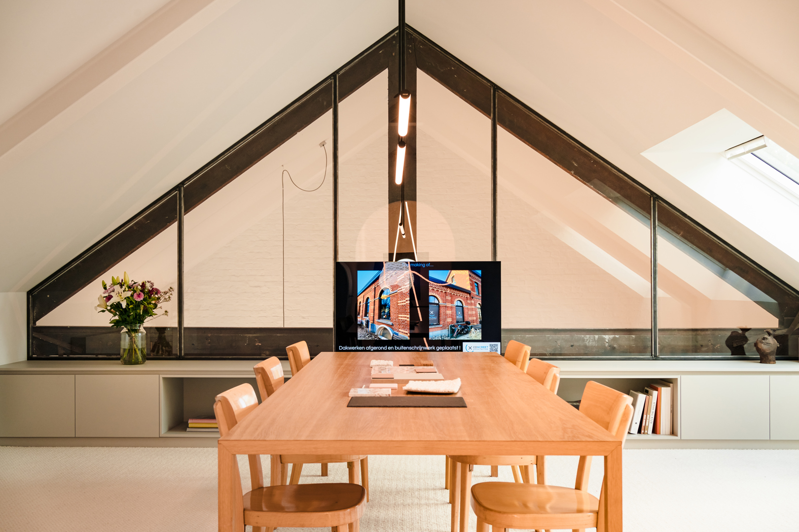 De renovatie combineert een groot respect voor het verleden met hedendaagse duurzaamheidsprincipes. De asbestleien verdwenen, het dak werd volledig vernieuwd en de gevel zorgvuldig gerestaureerd. De buitenkant behield zo haar historische karakter – van de markante dakvormen tot de geprofileerde raamomlijstingen – maar binnenin voltrok zich een ware metamorfose. Het voormalige station kreeg een nieuwe indeling met een kantoorgedeelte voor Concreet Architecten en een woning op de bovenverdieping, elk met een eigen sfeer en afwerking.