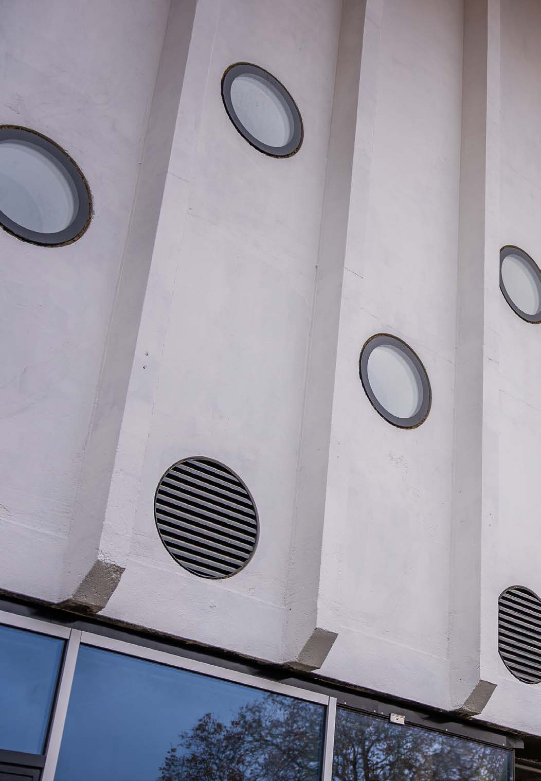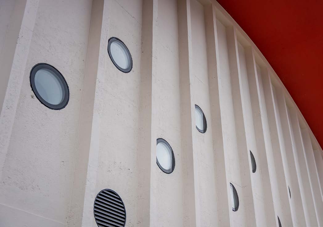 Een stabiele en droge ondergrond is één van de prioritaire voorwaarden voor gevelsystemen. Om de oude en niet goed hechtende verflagen te verwijderen maakte de aannemer gebruik van zandstralen, schuren en reinigen onder hoge druk. De hoofdaannemer heeft eerst het blootliggend staal en het betonrot laten herstellen, bijkomend is kathodische bescherming toegepast. Daarna werden grote ronde openingen geboord in de structuur waar nieuw buitenschrijnwerk in werd geplaatst om het gebouw ‘een speels karakter’ te geven.