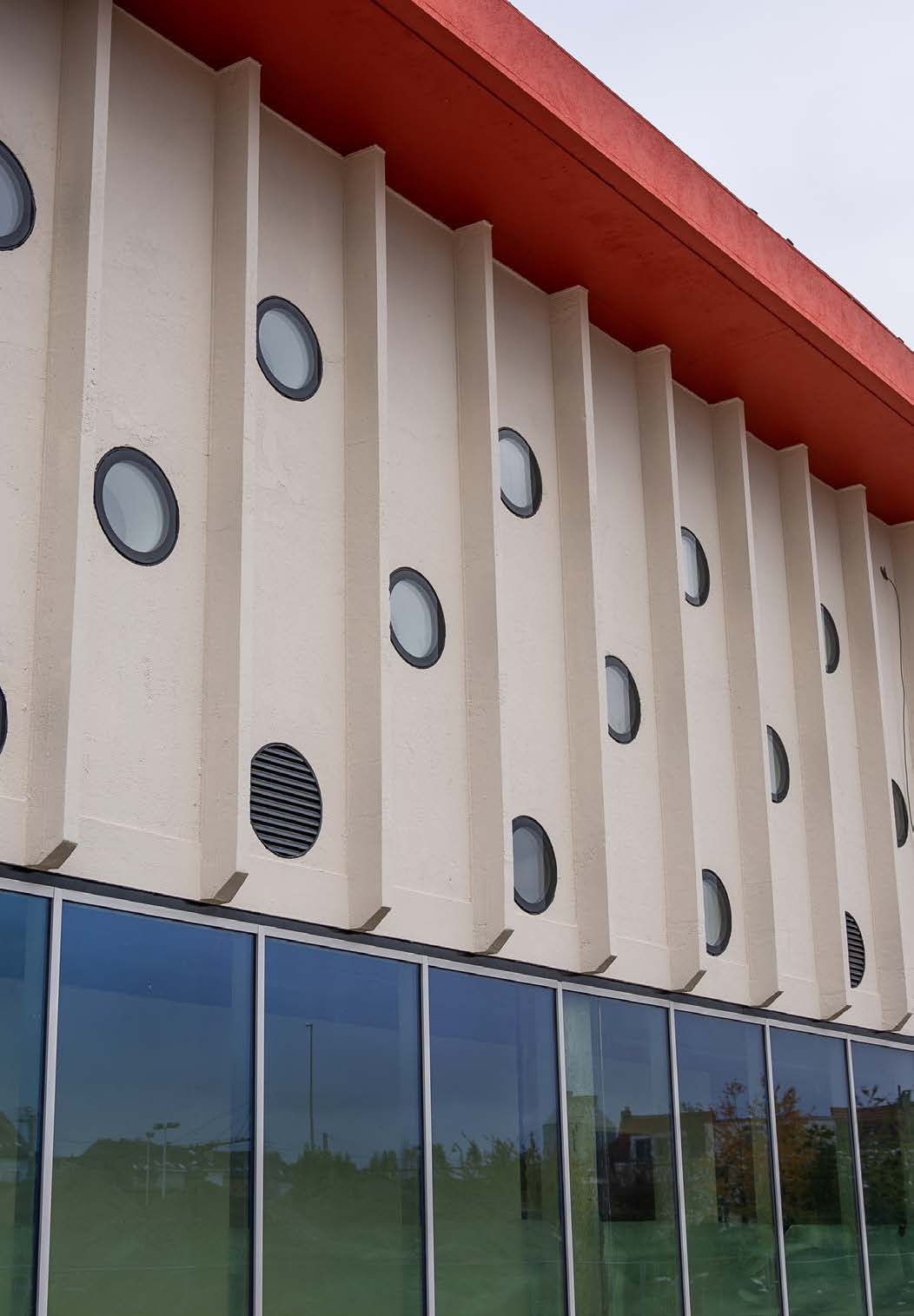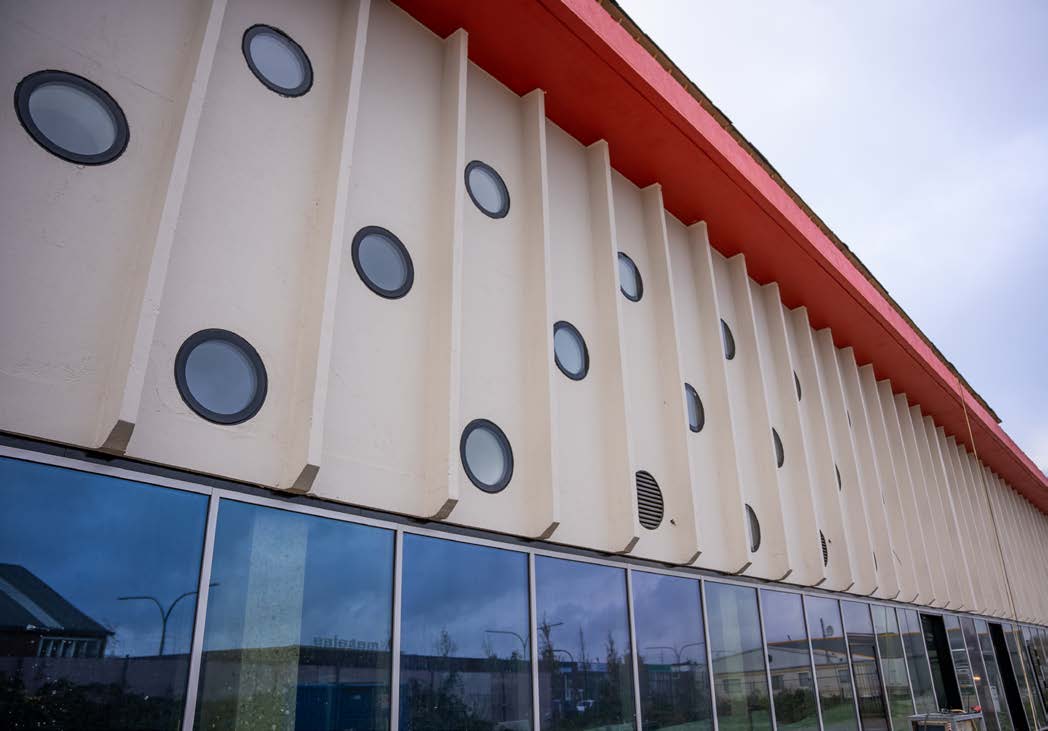 In het originele ontwerp voorzag de architect een StoTherm Classic® isolatiesysteem op de gevels. Pas laat in de ontwerpfase besloot het bouwteam na overleg om aan de binnenzijde te isoleren. De buitenste gevelschil en de rode dakbogen dienden hierdoor wel te worden voorzien van een duurzame bescherming.