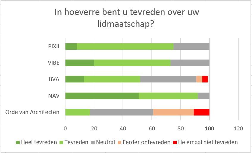 PIXII en VIBE hielden elkaar qua lidmaatschap bij de architecten min of meer in evenwicht. Dat geldt ook zo voor de tevredenheidscijfers. Ongeveer 75 % van de leden van beide organisaties zijn tevreden of heel tevreden over hun lidmaatschap en niemand is ontevreden.