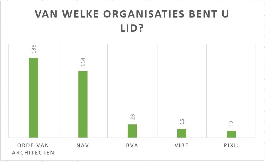 We hebben zes mogelijke organisaties in de vragenlijst opgenomen: de Orde van Architecten, NAV, BVA, VIBE, PIXII en ARIB.