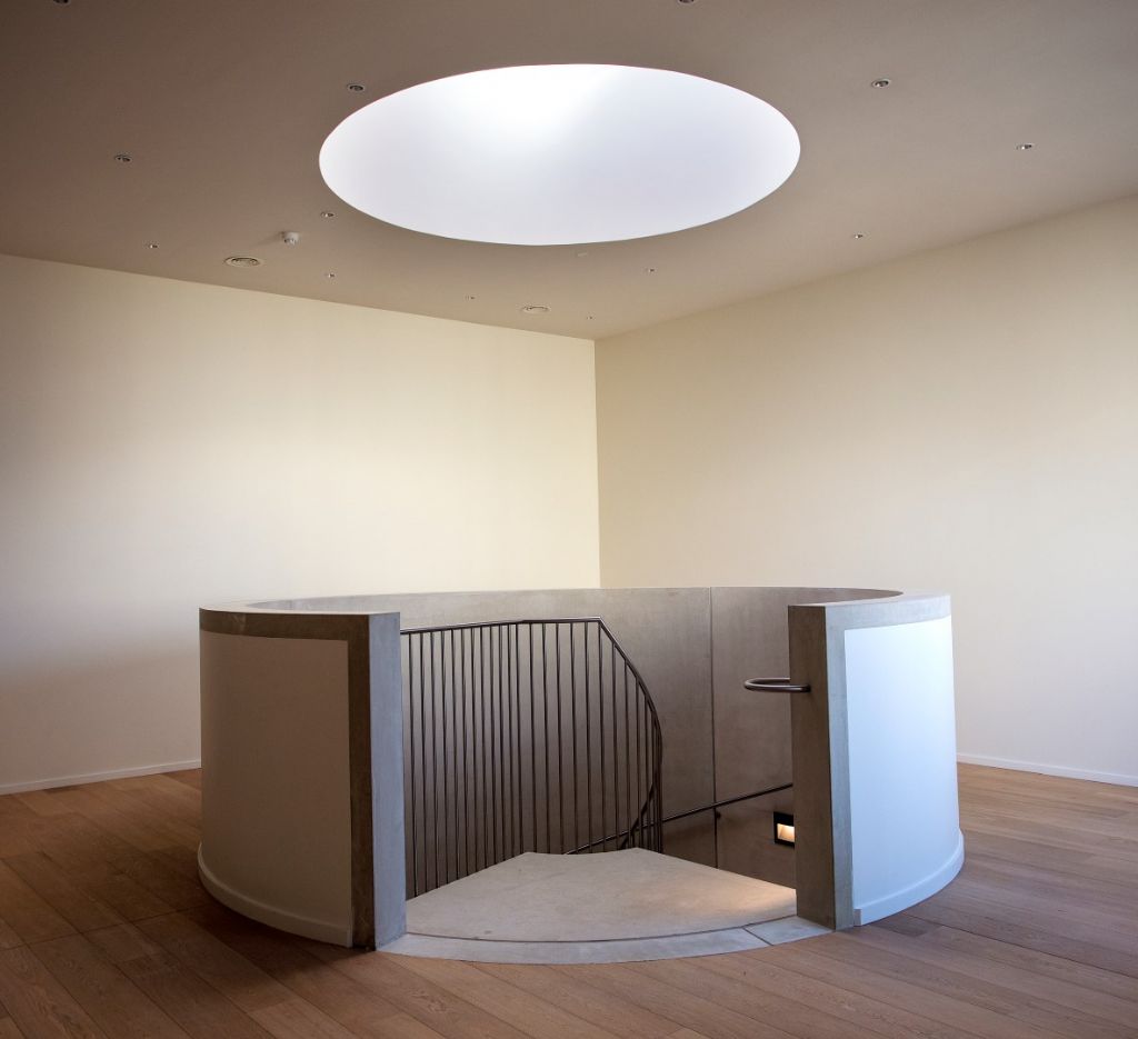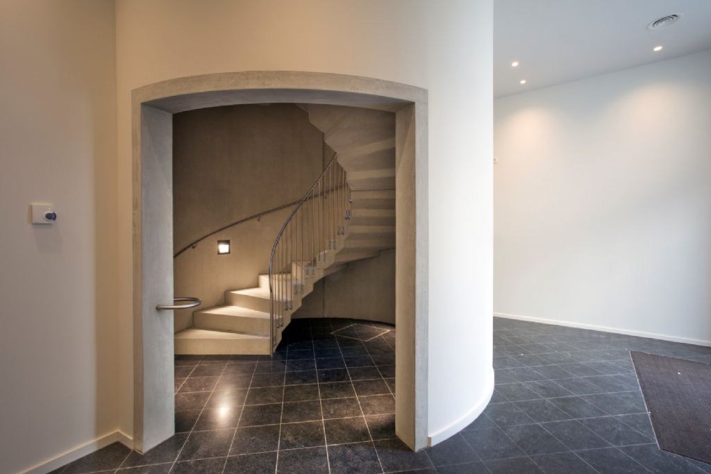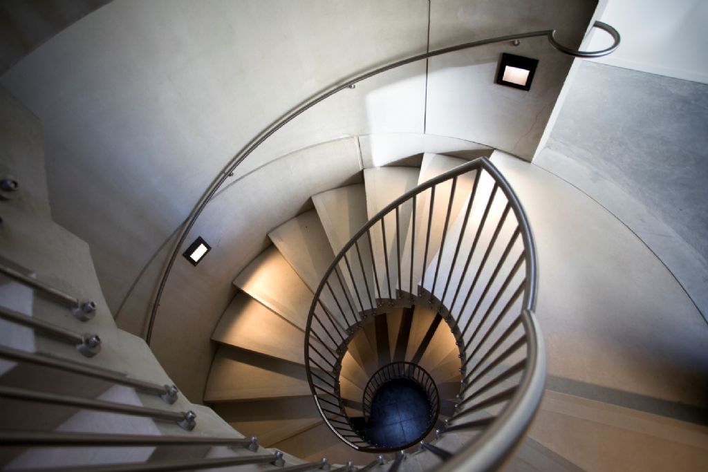 Wat Vandenhove vaker doet, is de trap geïsoleerd in de ruimte plaatsen, zodat het een apart object wordt. Het is draaitrap die de verschillende niveaus verbindt en het statische van de architectuur ook doorbreekt en zo een balans brengt. Door de trap zit de lift wat meer verborgen om ervoor te zorgen dat men in de eerste plaats de trap zou gebruiken.