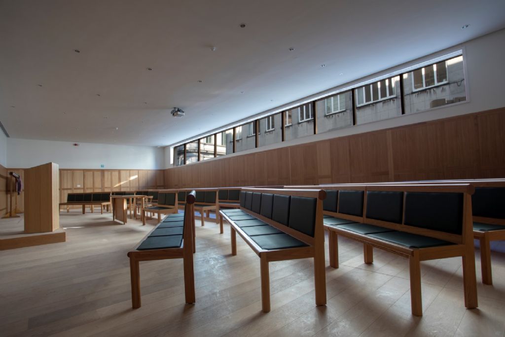 Opdat het auditorium en de tentoonstellingszaal niet zouden galmen als een kerk door de hoge beglazing, de harde parketvloer en houten wandbekleding en zitbanken, werd het plafond onzichtbaar bekleed met de marmerzandpleister BASWA Phon Fine van Sonogamma. Door de plaatsing van het innovatieve akoestische systeem wordt de verstaanbaarheid gegarandeerd en kan men in alle comfort hoorcolleges en exposities bijwonen en gaat alle aandacht uit naar de imposante kunstcollectie.