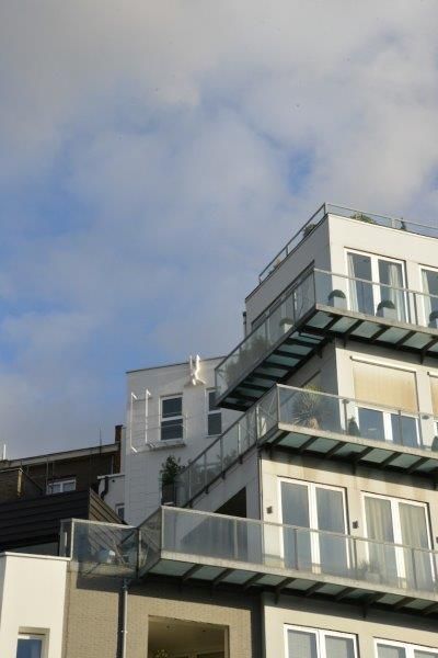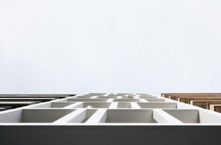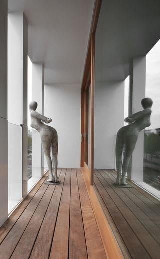 De ‘witte doos’ kraagt 60 cm uit het zwarte gevelvlak. Het woongedeelte loopt van de tweede tot de zevende verdieping. Op de achtste verdieping is er een terugspringende etage in zink met een plat dak. De uitkragende terrassen bestaat uit betonnen gevelelementen met speels verspringende verticale kolommen.