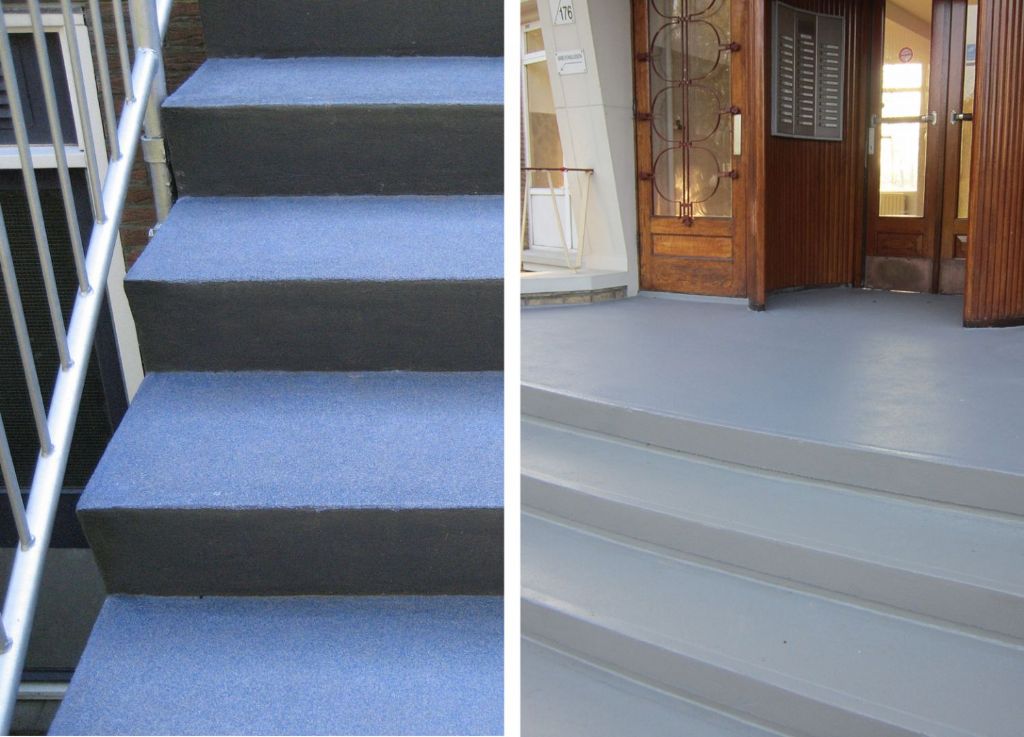 Door een vloeibaar aangebrachte coating worden alle details van elke trapconstructie naadloos afgedicht. Ook hekwerksteunen kunnen op deze manier duurzaam worden behandeld.