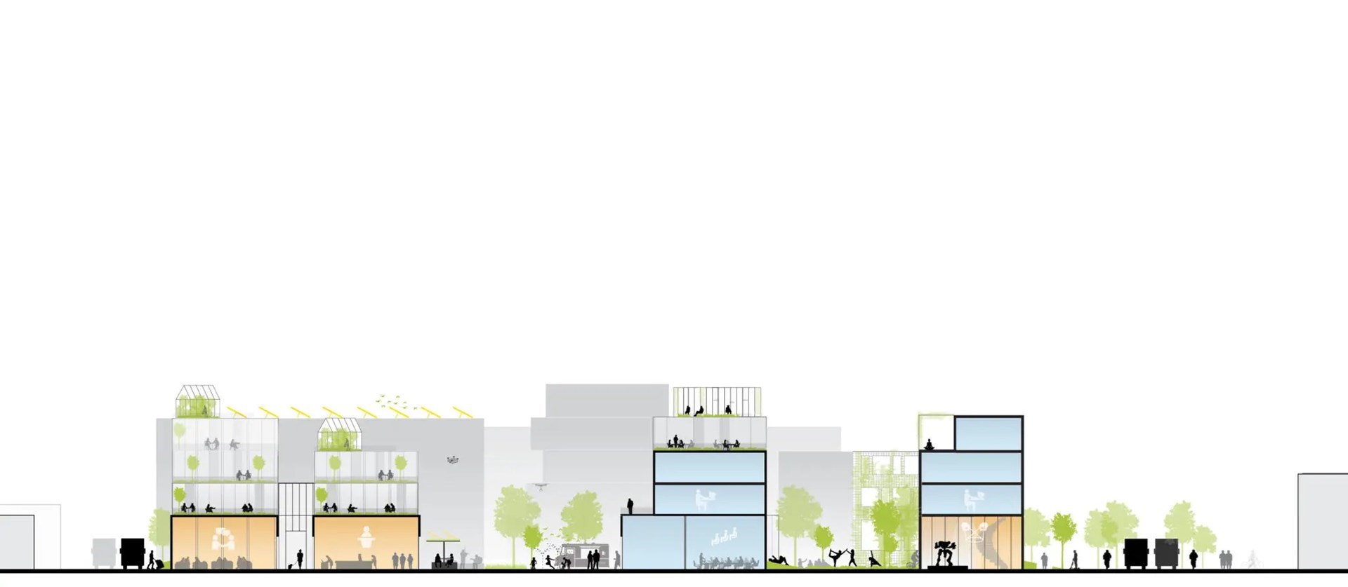 Dynamische interactie tussen binnen en buiten, tussen natuur en architectuur, kenmerkt deze beloopbare campus. Transparante plinten maken voorbijgangers nieuwsgierig naar wat zich afspeelt in de kantoren en labs, en speelse pixelvormige gevels met hoogteverschillen en groene loggia’s laten de overgang tussen gebouw en natuur vervagen.