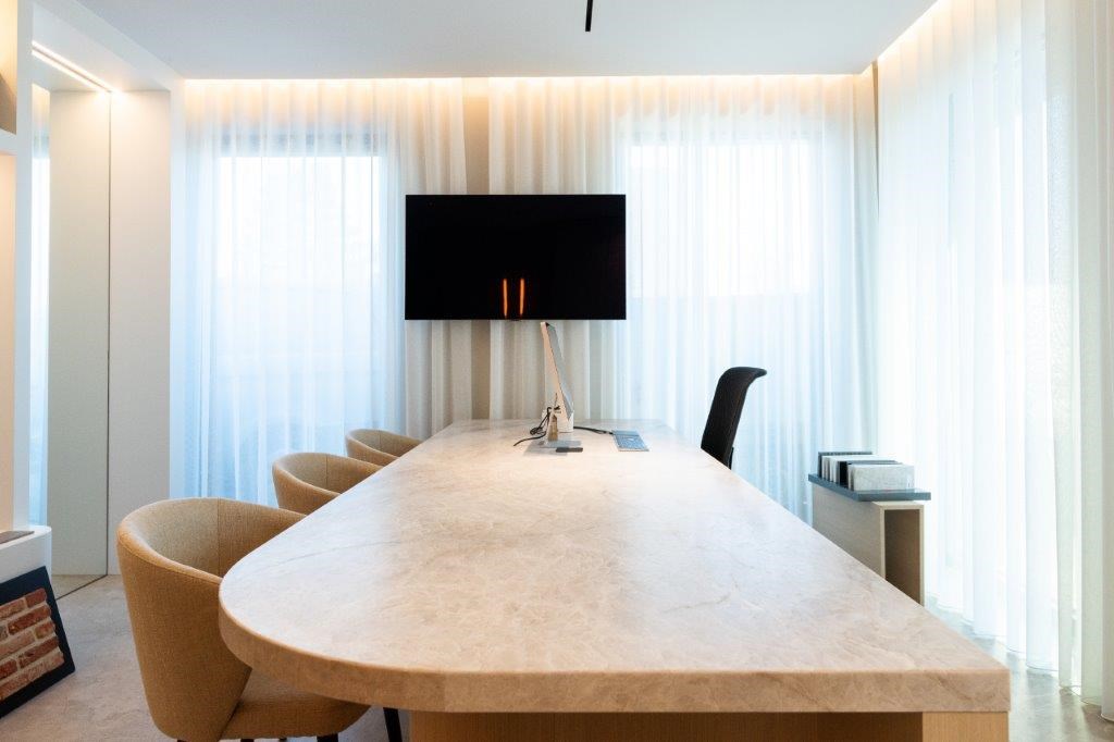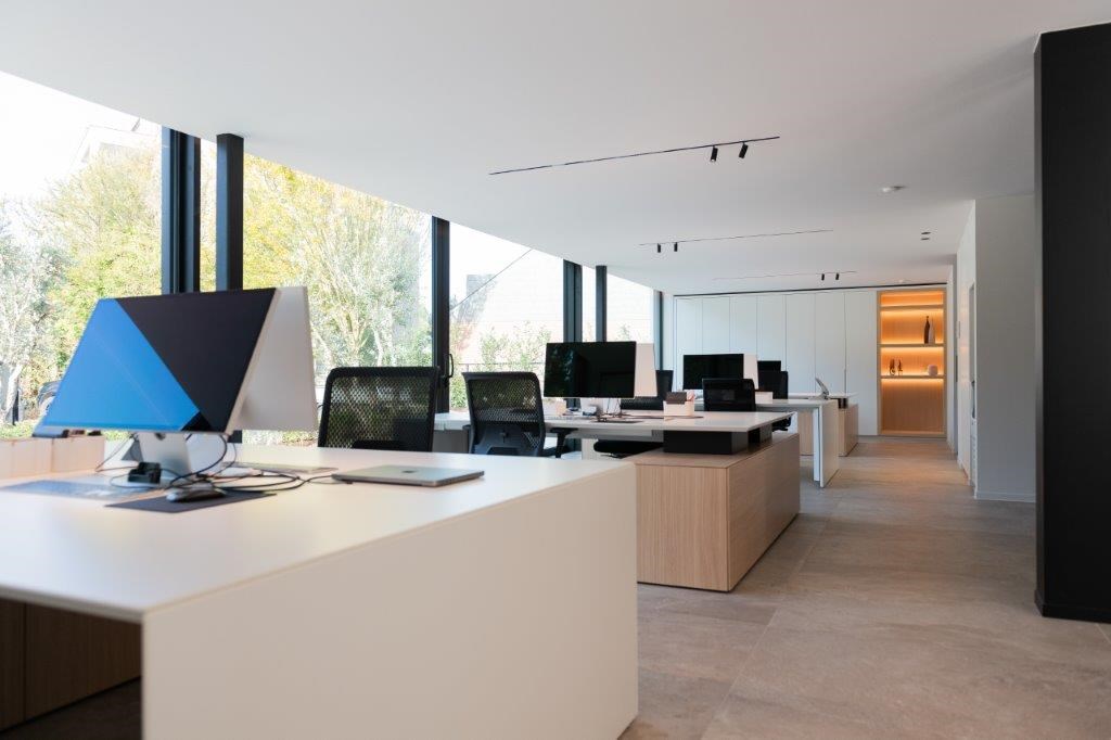 Missie geslaagd, met huiselijkheid, klantenbeleving en optimaal ruimtegebruik als kernwoorden. Het interieurconcept is opgebouwd rond terugkerende natuurlijke tinten en materialen, waarbij fineer en Taj Mahal-kwartsiet een belangrijke constante vormen. “De centrale vergaderzaal is het kloppend hart van ons kantoor, waarrond alle andere functies geschakeerd zijn (inkombalie, eetruimte met kitchenette, landschapsbureaus, directiebureaus …). Kers op de taart is de inspiratieruimte, waar we klanten via allerhande stalen kunnen laten zien welke hoogwaardige afwerkingsmaterialen we kunnen toepassen”, legt Ilse Bauwens uit. “Daarnaast vinden we het belangrijk dat ook onze medewerkers zich hier goed voelen. Vandaar de keuze voor werkplekken met een maximale natuurlijke lichtinval. We kloppen met z’n allen lange dagen, dus dan is een gezellige kantooromgeving geen overbodige luxe.”