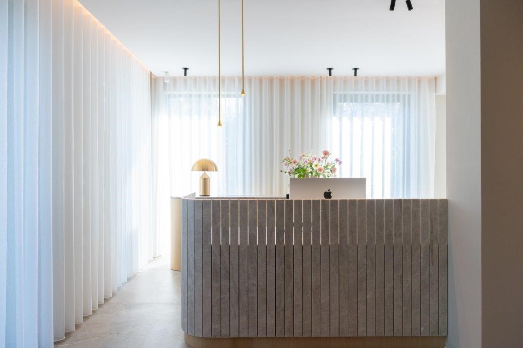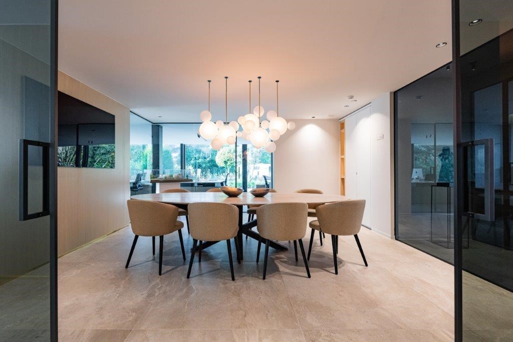 “In die zin is ons kantoor een verlengde van waar we als vastgoedontwikkelaar voor staan. Onze klanten kunnen hier de sfeer en kwaliteit van hun toekomstige woning ervaren en de nodige inspiratie opdoen. De Taj Mahal-kwartsiet die op veel plekken terugkeert in ons interieur – van inkombalie over vergadertafel tot sanitair – wordt nu opvallend vaker gekozen”, glimlacht Ilse Bauwens. “Het leuke is ook dat iedereen van ons team zijn of haar steentje heeft bijgedragen aan dit project. Tussen alle lopende opdrachten door zijn we samen op zoek gegaan naar geschikte materialen en de juiste verlichtingsarmaturen, waaronder fijnzinnige koperen pendeltjes en de handgemaakte glazen designlamp boven de vergadertafel. Dit kantoor voelt dan ook echt aan als een tweede thuis.”