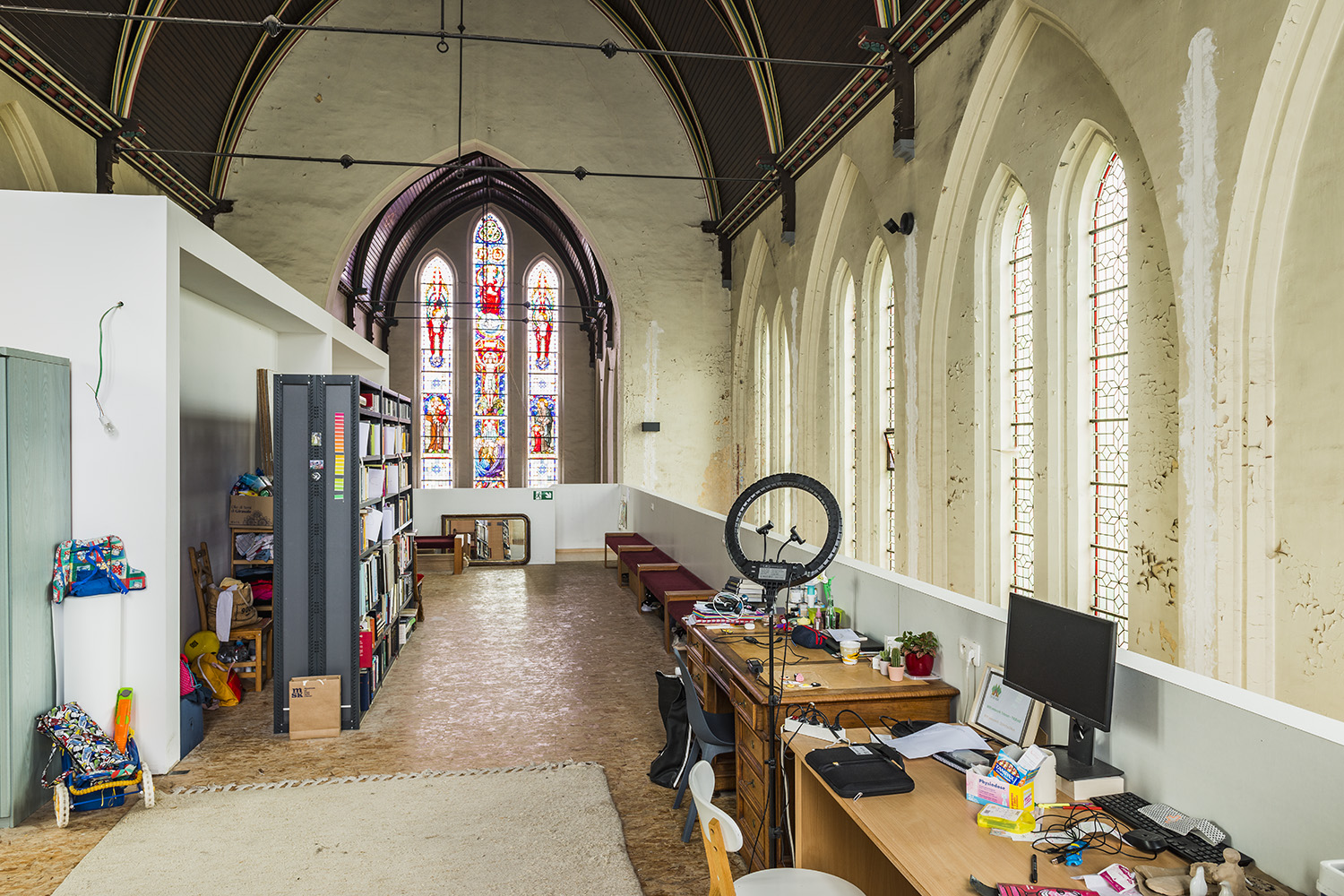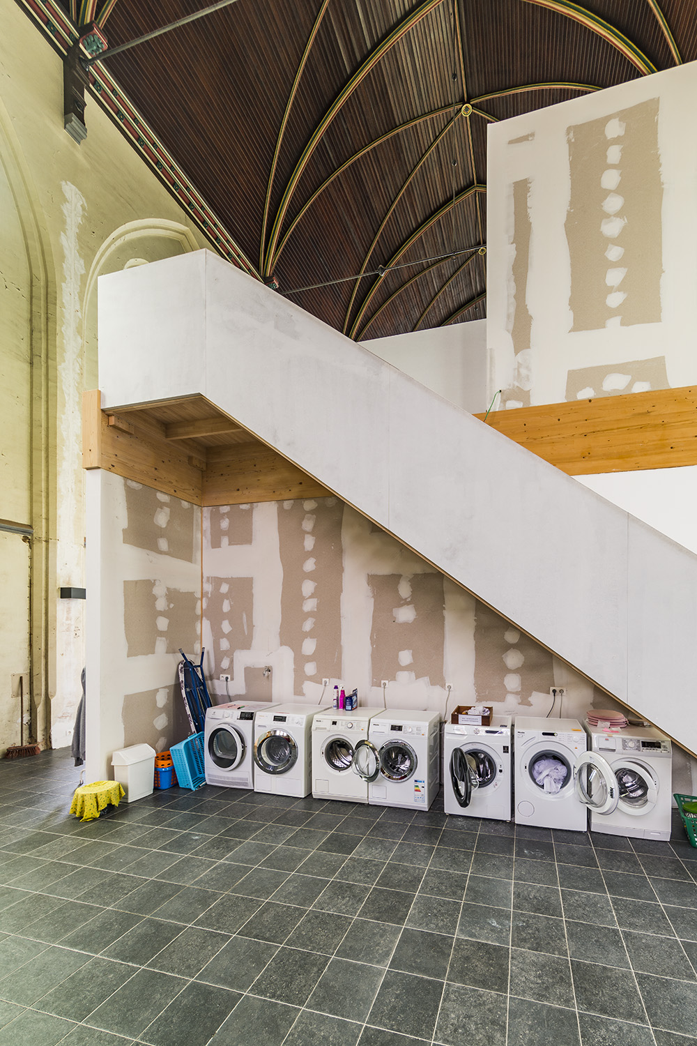 Ook het kerkgebouw, dat dateert van 1880, was niet meer in gebruik en al even ontwijd. Een plaatselijke vzw van de kerkfabriek was belast met de verkoop van de site en kwam tegenover Hilde en Alexis aan de onderhandelingstafel te zitten: “Hun voorkeur ging uit naar een herbestemming met een sociale functie, zoals de kerk die ook lang had gehad. Toen we ons sociaal cohousingproject met gemeenschappelijke ruimtes uit de doeken deden, bleken ze onze plannen genegen te zijn.”