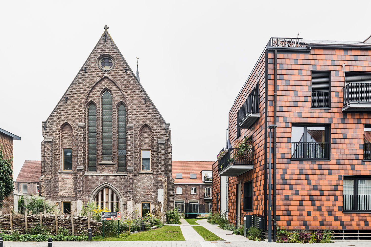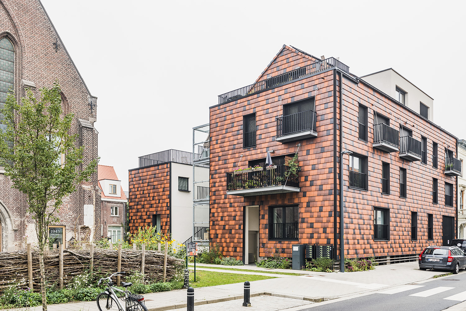 Behalve de kerk draagt ook de niet-alledaagse gevelbekleding van het tuingebouw en poortgebouw bij aan de herkenbare identiteit van het project. Er werd gekozen voor tegelpannen in drie kleurschakeringen. Door de demontabele afwerking kan de gevel later indien nodig makkelijker worden aangepast of zelfs in een volledig nieuw kleedje gestoken, zonder dat het materiaal grotendeels verloren gaat. Enkel de optopping van het tuingebouw, met daarin ook het appartement van Hilde, is voorzien in kalkpleister zodat het volume wat minder groot oogt.