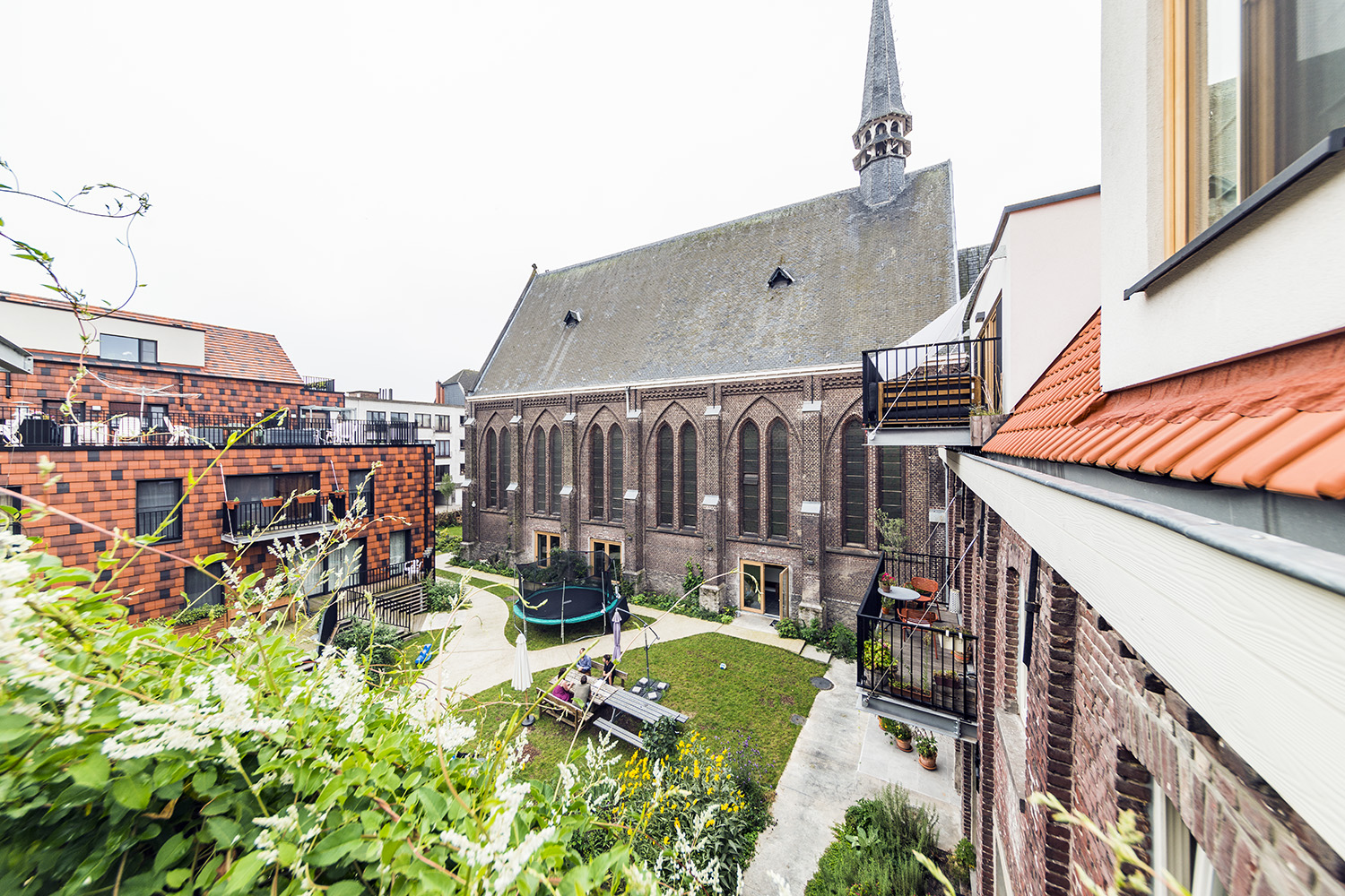 Daarnaast zijn in het gerenoveerde kerkgebouw nog tal van andere gemeenschappelijke functies ondergebracht. Er zijn logeerkamers, werkplekken, speelruimte, een fietsenberging en zelfs een wasserette. Voor Hilde en haar medebewoners is het de logica zelve: “Als je de ruimtes die je niet dagelijks gebruikt, deelt met anderen, kun je zelf kleiner wonen zonder in te boeten aan luxe en comfort.” Hetzelfde geldt voor de buitenruimte. Hoewel elke woning over een klein terras of privé-tuintje beschikt, vinden we de bewoners van het cohousingproject op zonnige momenten vooral terug in de weelderige gedeelde binnentuin.