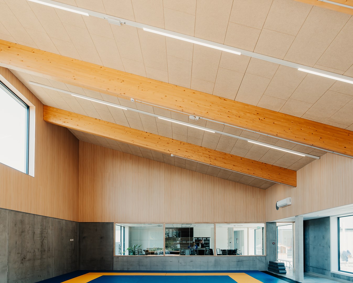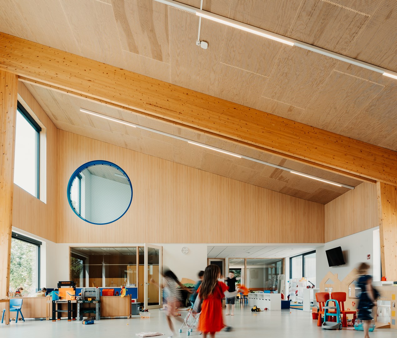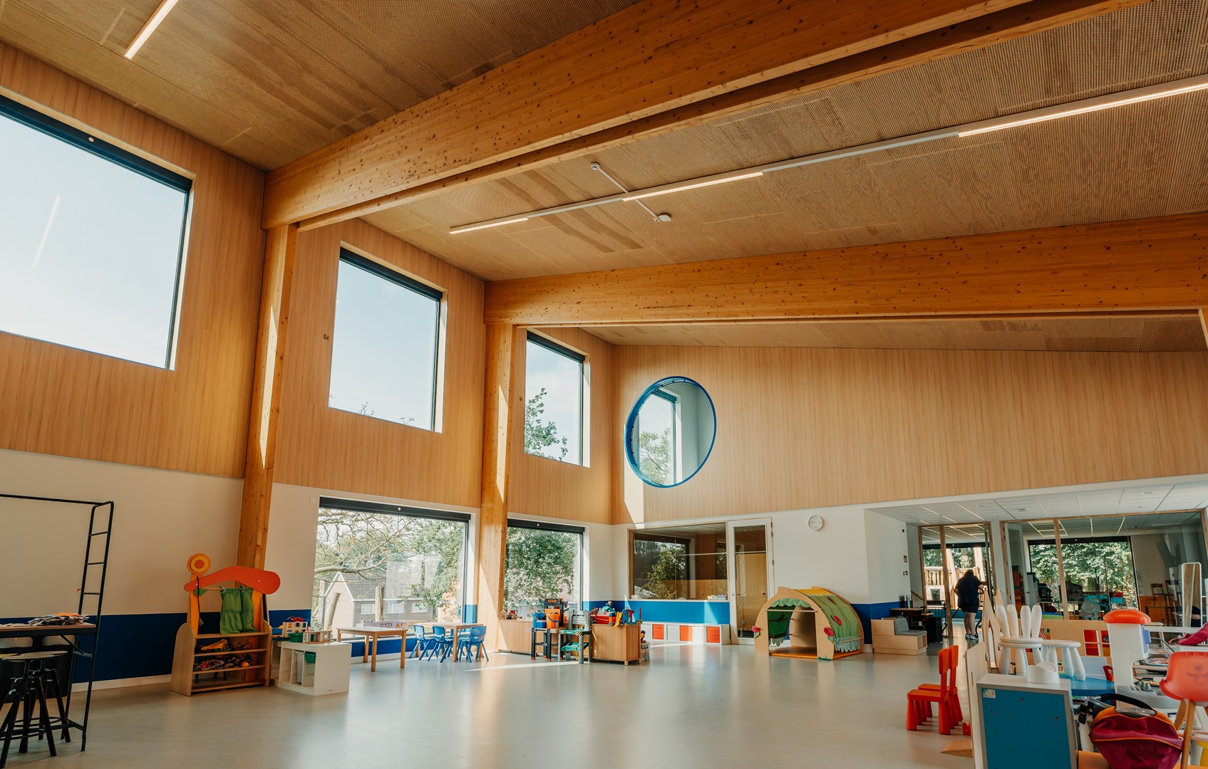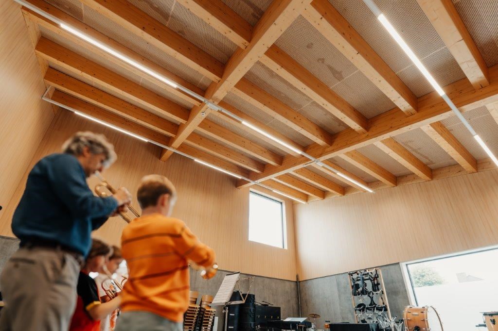 In het muzieklokaal, Sint-Maartenshuis en het kinderdagverblijf integreerde ze Usystem Roof DS met Ply P Perf. Het geperforeerde dennenhout zorgt niet alleen voor een verbeterde akoestiek, maar ook voor een warme sfeer.