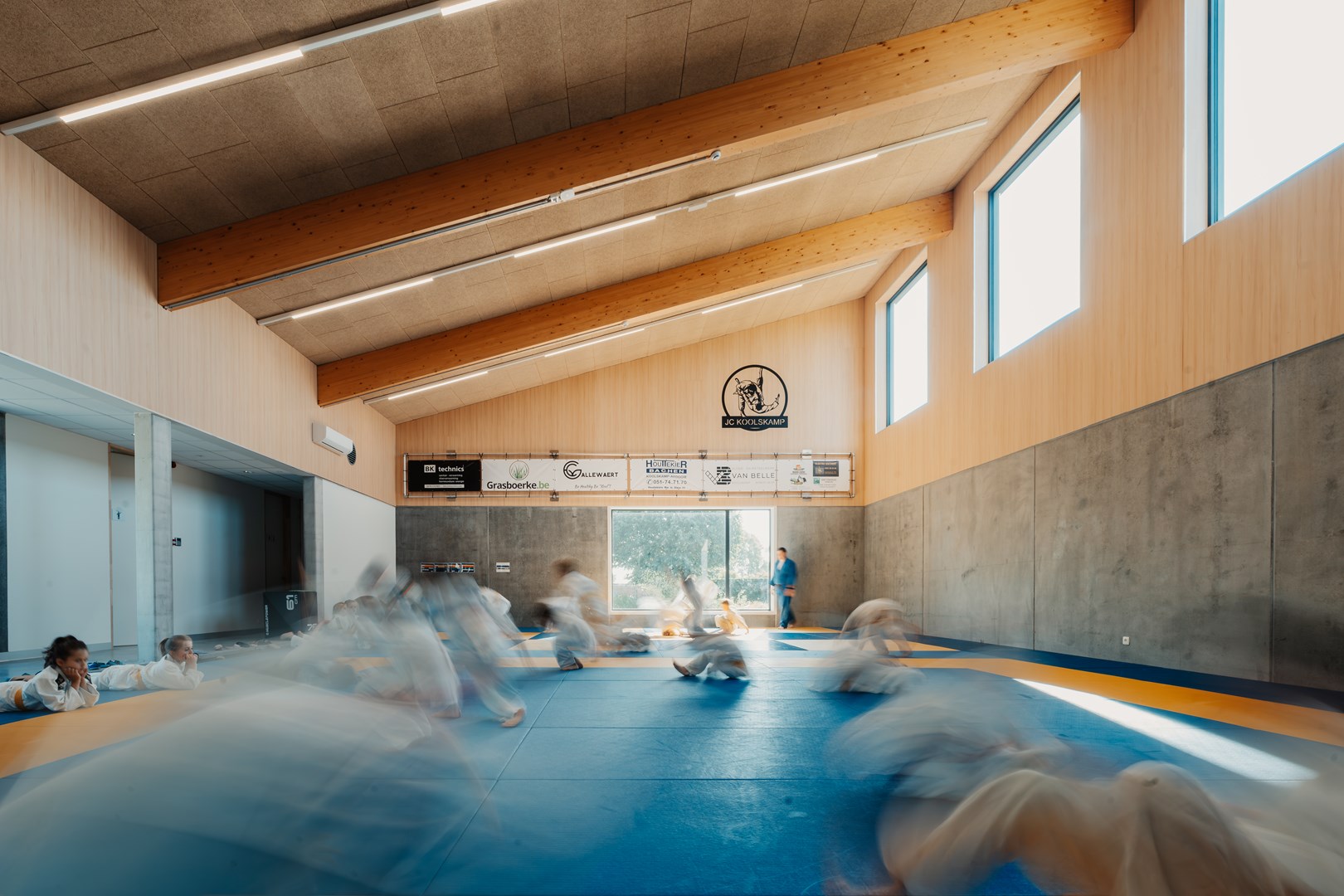 In Koolskamp maakte de oude gemeenteschool plaats voor een nieuw gemeenschapscentrum. In deze nieuwbouw is er plaats voor een repetitieruimte, een polyvalente zaal, een judozaal en een kinderdagverblijf. Om een goede akoestiek te garanderen in het gebouw koos architectenbureau Verfaillie-Boucquet voor Usystem Roof DS Acoustic met Wood Wool als binnenafwerking voor de judozaal.