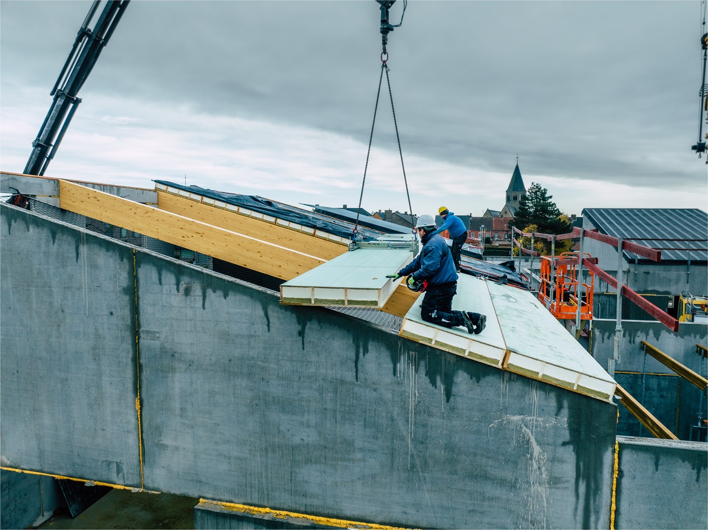 De DS Acoustic dakelementen zijn zelfdragend en isolerend. Unilin Insulation stelde ze samen uit een akoestisch absorberende zichtzijde, een kern die zowel thermisch isoleert als geluid absorbeert, een constructief geheel van vurenhouten kepers en een bovenplaat. Deze elementen bieden niet alleen een superieure akoestische prestatie, maar ook een brandweerstand van 30 minuten.