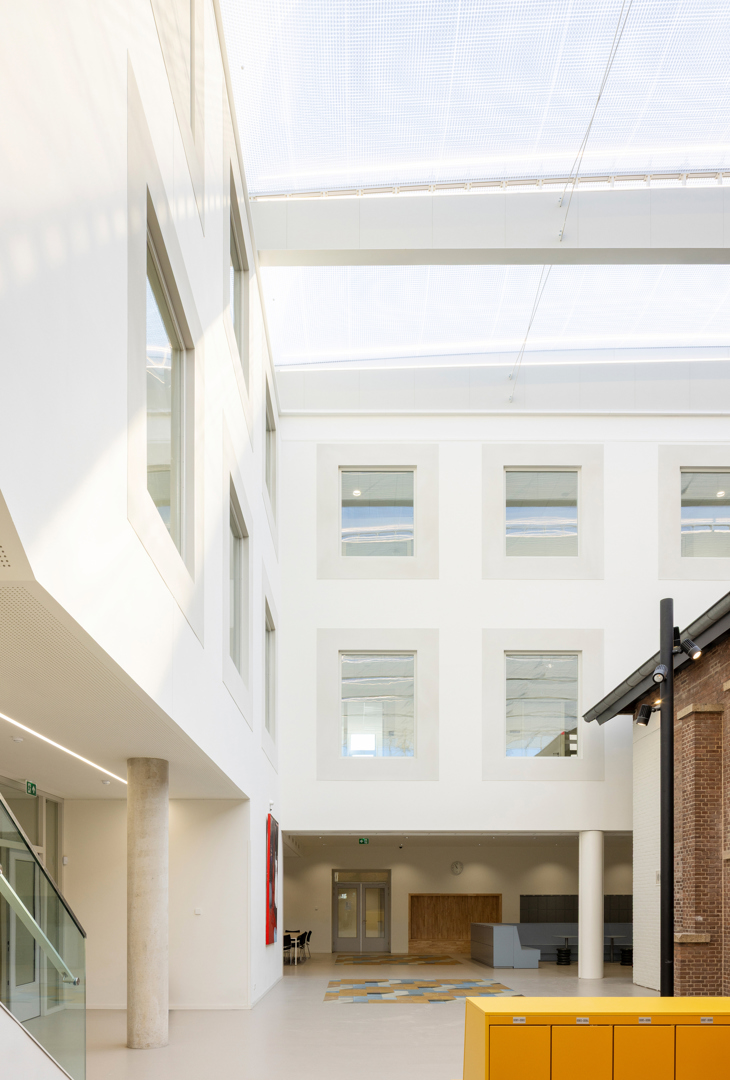 Bijzonder aan het ontwerp is de herpositionering van de oorspronkelijke aula. Deze is nu onderdeel van een groot atrium en vormt letterlijk en figuurlijk het hart van de school. Door het verwijderen van een tussenvloer en verlaagd plafond uit de jaren zeventig is de oorspronkelijke ruimtelijkheid hersteld, inclusief de houten spanten die opnieuw in het zicht zijn gebracht. De aula doet nu dienst als bibliotheek en theater en vormt een belangrijke ontmoetingsplek binnen het gebouw.