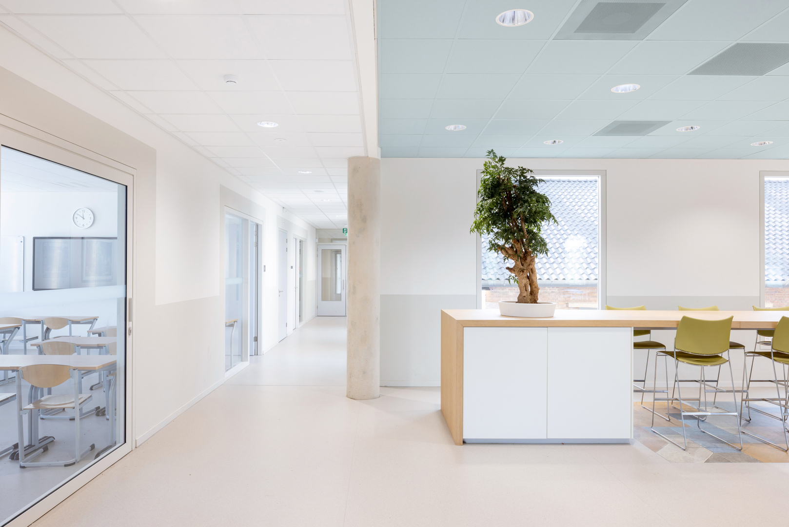 In de klaslokalen zijn plafonds voorzien van Rockfon Pallas-panelen in standaardwit en Color-all in de kleur ‘Fresh’ blauw. Voor de gymzalen en dojo, waar stootbelasting meespeelt, koos het afbouwbedrijf voor Rockfon Boxer-panelen. In de gangen van de nieuwbouw zijn vrijhangende Rockfon Krios-panelen toegepast zonder raster. Petersen: “De architect wilde een plafond zonder kader. Daarom hebben we Z-profielen gebruikt en een deel van het profiel zelfs verlijmd, na uitvoerige testen.”