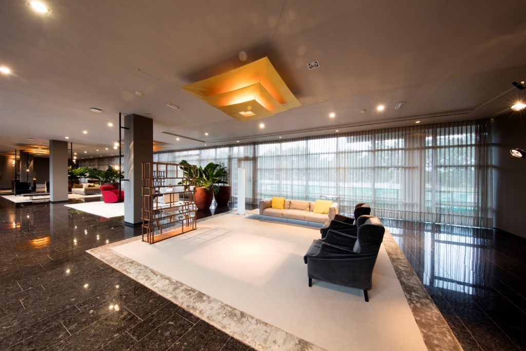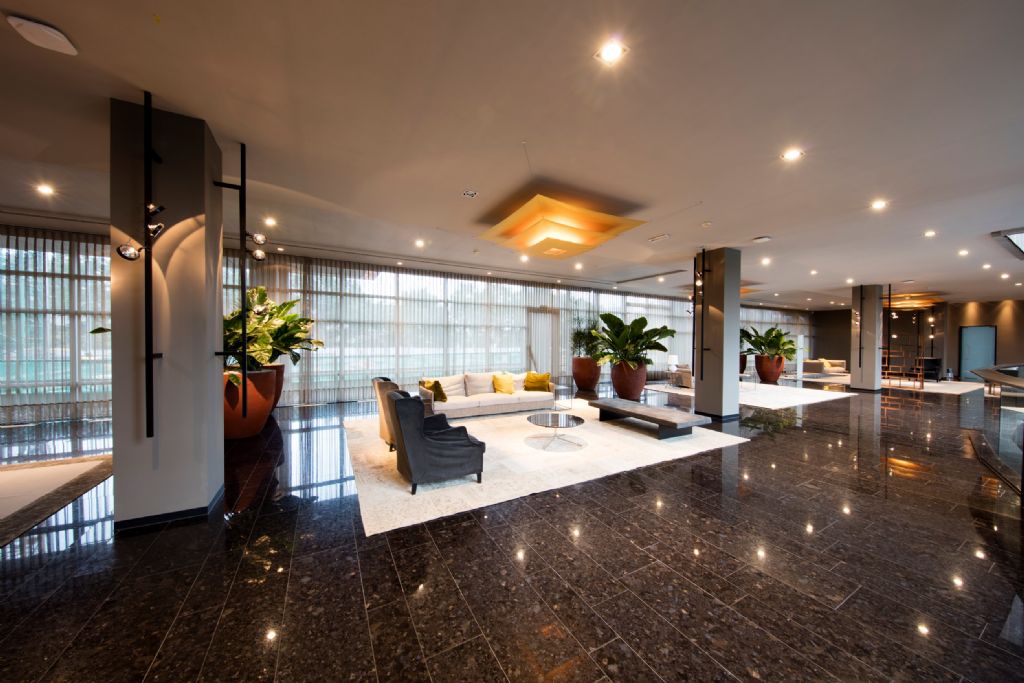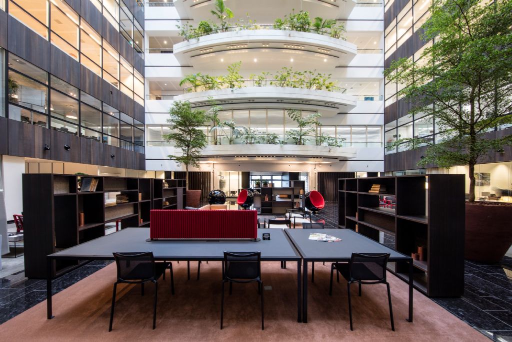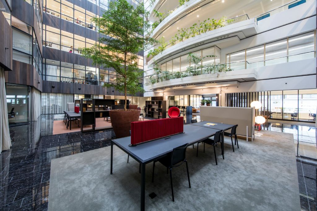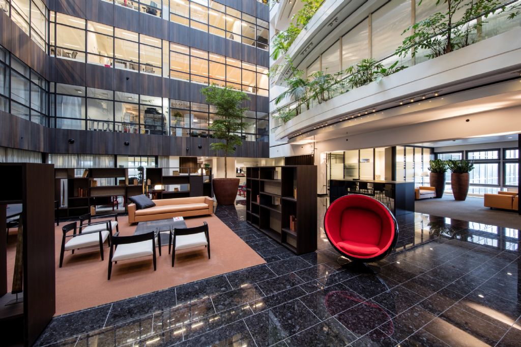 Het is belangrijk dat het hele gebouw een consistent thema heeft, terwijl elke ruimte haar eigen identiteit behoudt. Het Atrium straalt de look-and-feel uit van de hal en loungeruimte van een luxueus 5-sterrenhotel. Toch blijft het een kantoorwerkplek. Er is veel ruimte om samen met een collega te genieten van een kopje koffie, om even te vergaderen in een van de privéruimtes, of om een formele zakenlunch te organiseren in het fraaie restaurant.