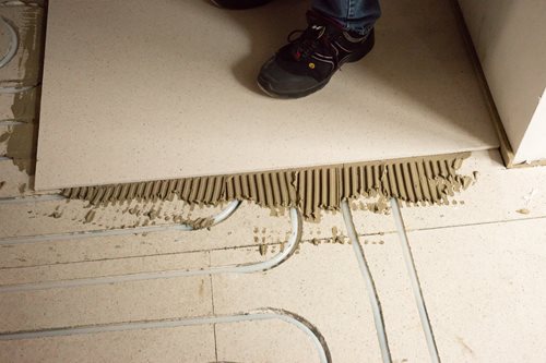 Er is gekozen voor een vloerverwarmingssysteem op basis van droogbouw. Dit systeem is zeer geschikt voor renovaties of situaties waar een natte vloer geen optie is en het biedt ook een duurzame keuze. De fermacell® vloerelementen type 2E33 zijn gebruikt als droge dekvloer. Deze elementen zijn toepasbaar bij renovaties, verbouwingen van bestaande gebouwen en nieuwbouwprojecten, vooral waar lucht- en contactgeluidisolatie en brandwerendheid belangrijk zijn. In de platen zijn sleuven gefreesd door vloerverwarmingsspecialist JK Vloerverwarming voor de verwarmingsbuizen.