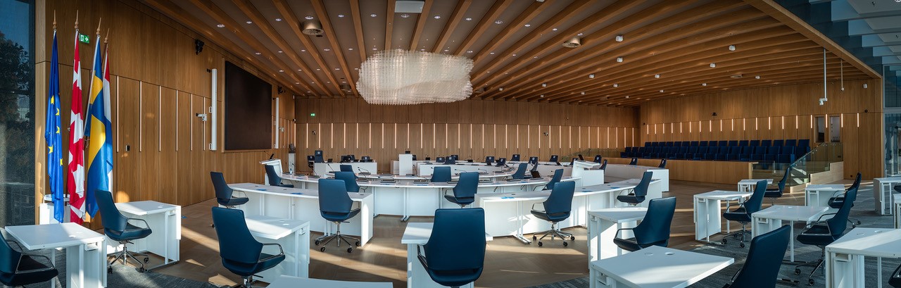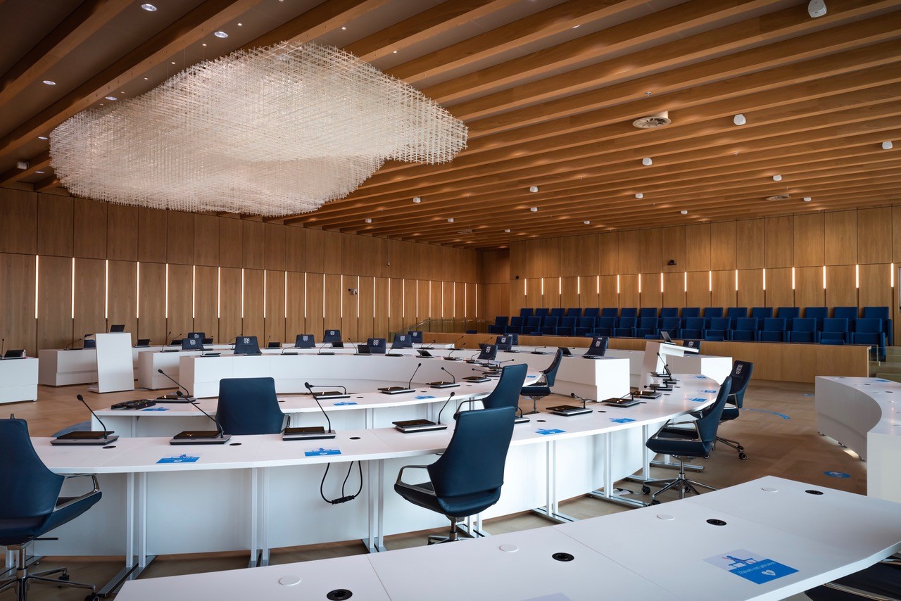 Het bijzondere van deze toepassing van akoestische panelen in het Stadskantoor is de technische detaillering. Zo heeft Dedrie architecten bijvoorbeeld de layout van de Nano fineer eiken panelen in de raadzaal afgestemd op de lijnen van de parketvloeren en de lijnen van de plafondhoutsecties en raampartijen. Een hele uitdaging voor een interieurbouwer en materialenleverancier om alles op elkaar af te stemmen.