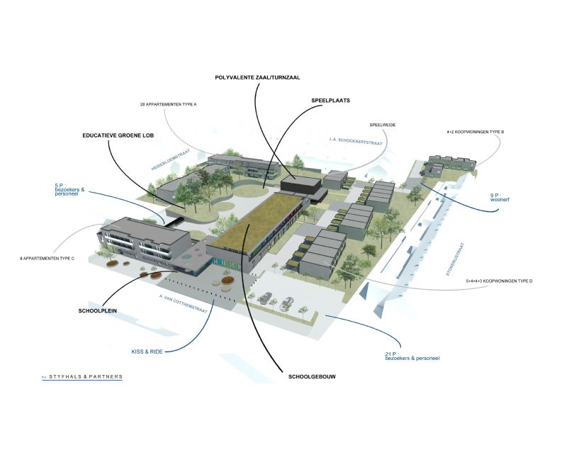 Dat woonerf is een deel van het masterplan dat Styfhals & Partners ontwierp voor de hele site. Naast het schoolgebouw hield dat dus ook eengezinswoningen, appartementen, een commerciële ruimte, een speelweide en een kinderdagverblijf in. Tussen de andere gebouwen en de school zorgden de ontwerpers wel voor zachte buffers. Een ervan is een speelweide waaraan de ontwerpers een educatieve ‘Groene Lob’ koppelden. Die mix van bestaande bomen en aanvullende beplantingen genereert een bos dat in de speelplaats overvloeit en de schoolkinderen extra speelplezier geeft.