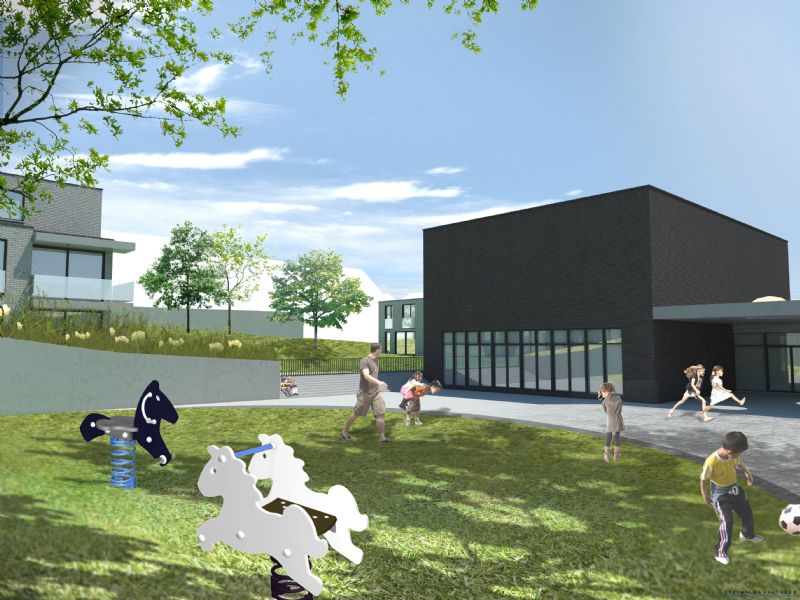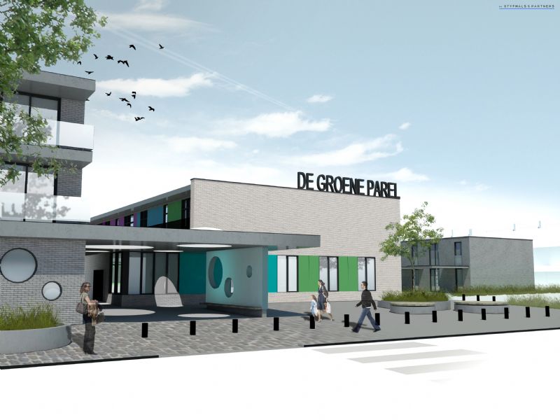 Basisschool ‘De Groene Parel’ in Sint-Pieters-Leeuw was aan vernieuwing toe. In de loop der tijd werden er op het groene schooldomein verschillende vaste gebouwen, paviljoenen en tijdelijke constructies ingepland die niet meer voldeden aan de noden van de school. Styfhals & partners maakte een ontwerp met duidelijke keuzes: ze verzamelden alle schoolfunctionaliteiten samen in één gebouw met een centrale ingang en creëerden tegelijkertijd een ‘Open School’, waar ook niet-schoolse activiteiten een plaats hebben.