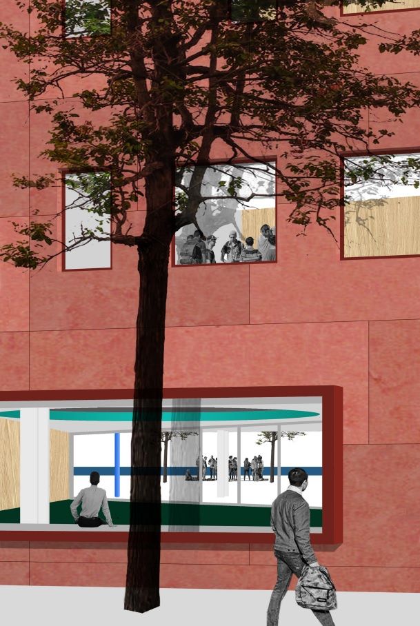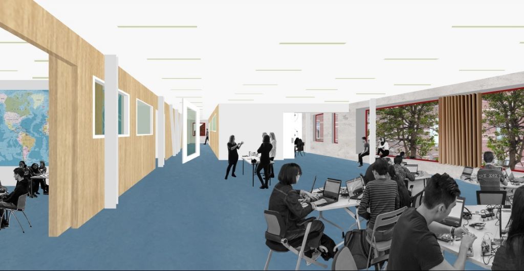 De eenvoudige en heldere planopbouw zorgt niet alleen voor een heel bevattelijk gebouw maar verzekert ook de vereiste korte bouwtijd. De polyvalente ruimte van het gelijkvloers krijgt een verlengde in de uit het volume uitgeholde overdekte buitenruimte en de aangrenzende speelplaats. Grote ramen in de polyvalente ruimte en de leerlandschappen tonen de school aan de stad en halen de stad binnen in de school.