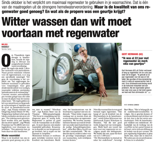 Om Vlaanderen te beschermen tegen droogte besliste de regering in februari om een aangescherpte hemelwaterverordening goed te keuren. Sinds 2 oktober zijn de regels van kracht voor particulieren. Naast grotere minimale volumes voor de regenwaterput is er nog een opvallende maatregel: het is namelijk verplicht om 'het opgevangen hemelwater maximaal te gebruiken voor toepassingen waar geen drinkwaterkwaliteit nodig is waaronder toiletten, poetswater, buitenkranen en de wasmachine'. Concreet moeten er dus aanvoerleidingen worden gelegd naar elk toilet en naar elke plaats waar de wasmachine komt.
