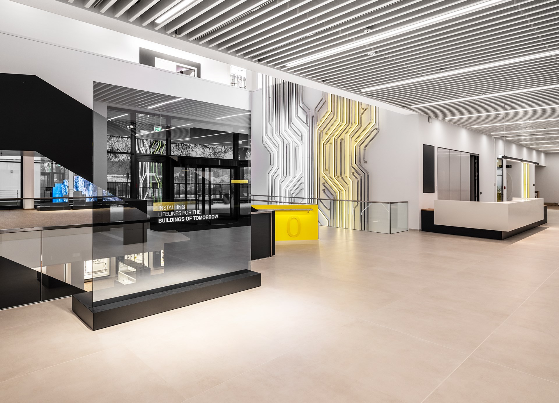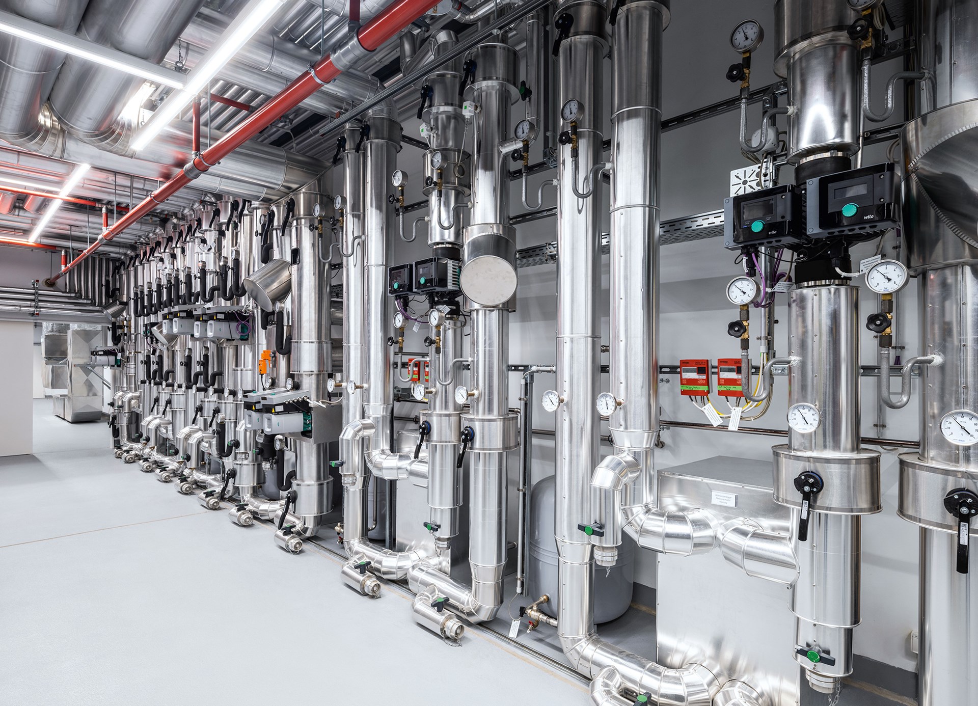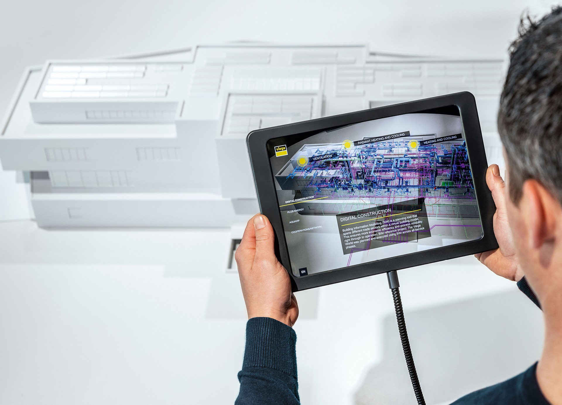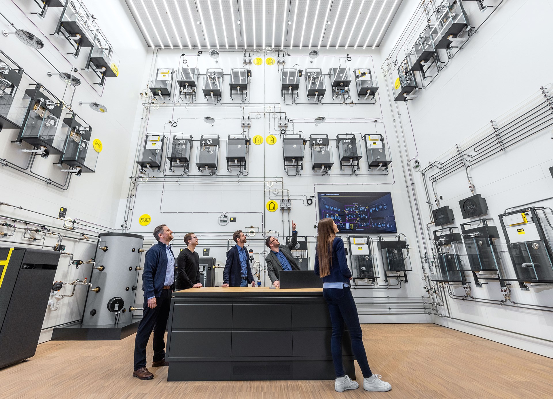 In het gebouw zelf staat dan ook alles in het teken van kennisoverdracht, zelfs het seminariecentrum zelf maakt deel uit van het trainingsprogramma. De gehele technische installatie van het gebouw zelf is in verschillende open schachten en doorheen de panelen in het plafond zichtbaar. Viega heeft het over het installeren van “de levenslijnen van een gebouw”, en die levenslijnen zijn gewoon zichtbaar. Meer nog, dankzij transparante schermen met livedata van meer dan 11.000 datapunten zie je ook gewoon wat er op elk moment in de leidingen gebeurt. Ook het BIM-model van het gebouw wordt handig gebruikt om informatie over te brengen, dankzij een ingenieuze toepassing die via iPads en een schaalmodel het hele leidingnetwerk over het gebouw toont.